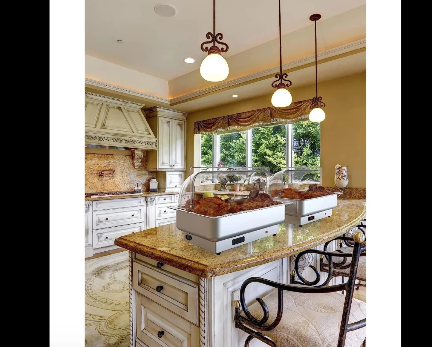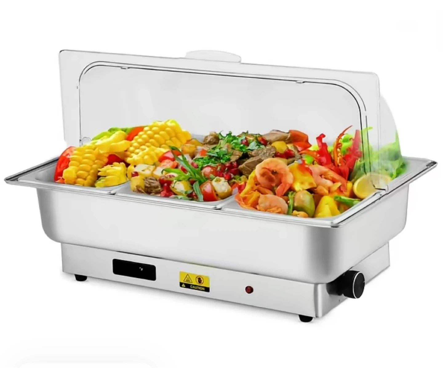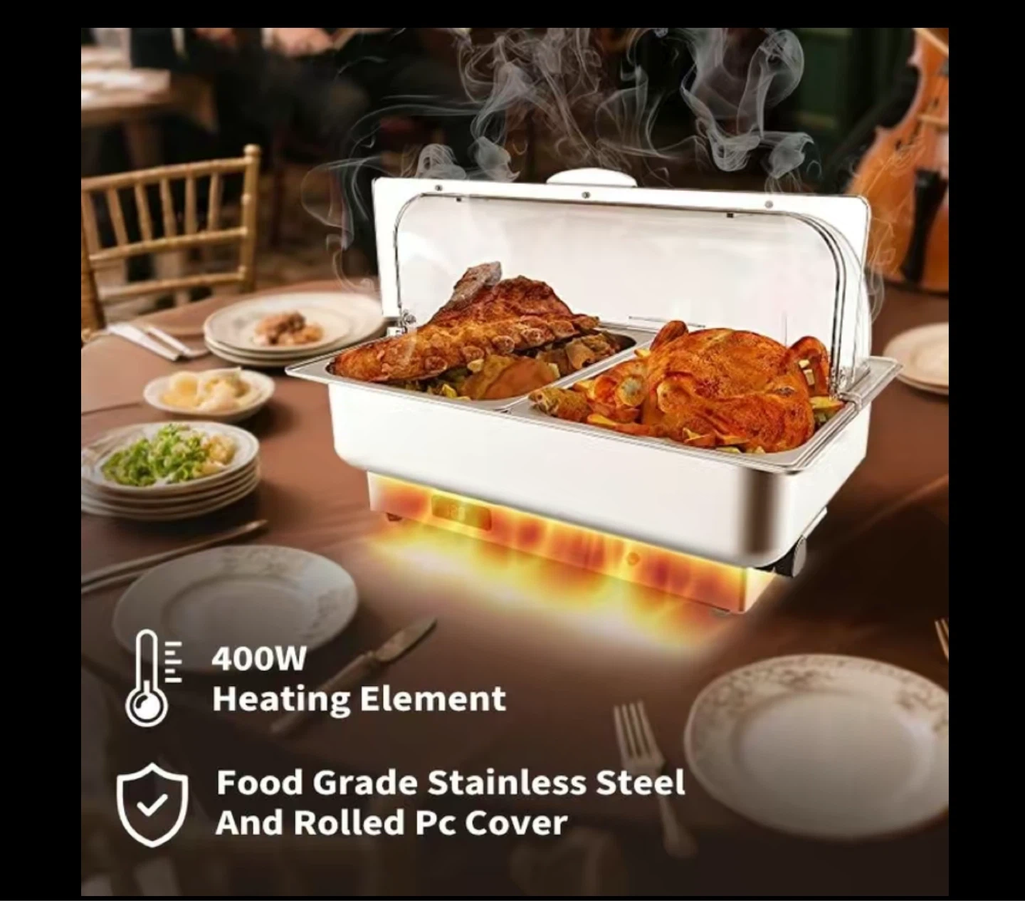 This chafing dish features a 400W heating element to keep food warm. It's constructed from food-grade stainless steel with a rolled PC cover. This is great for keeping dishes hot during gatherings!