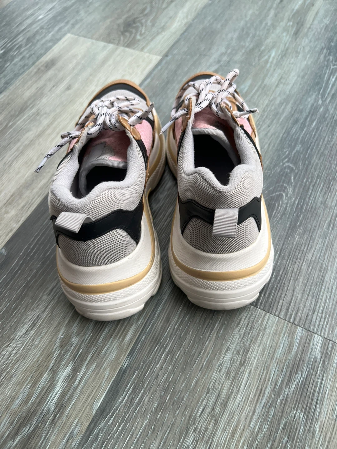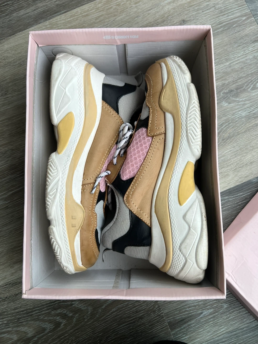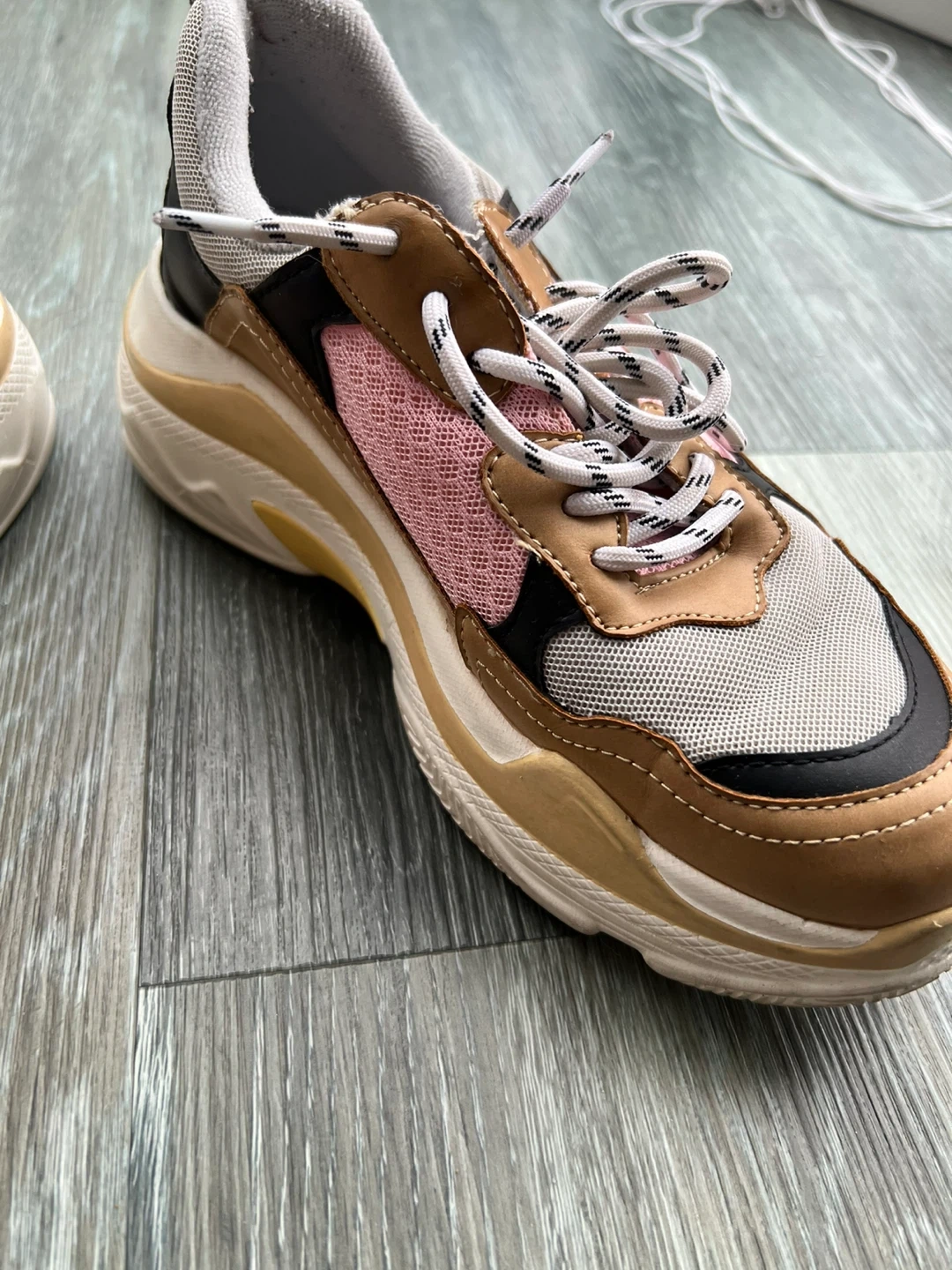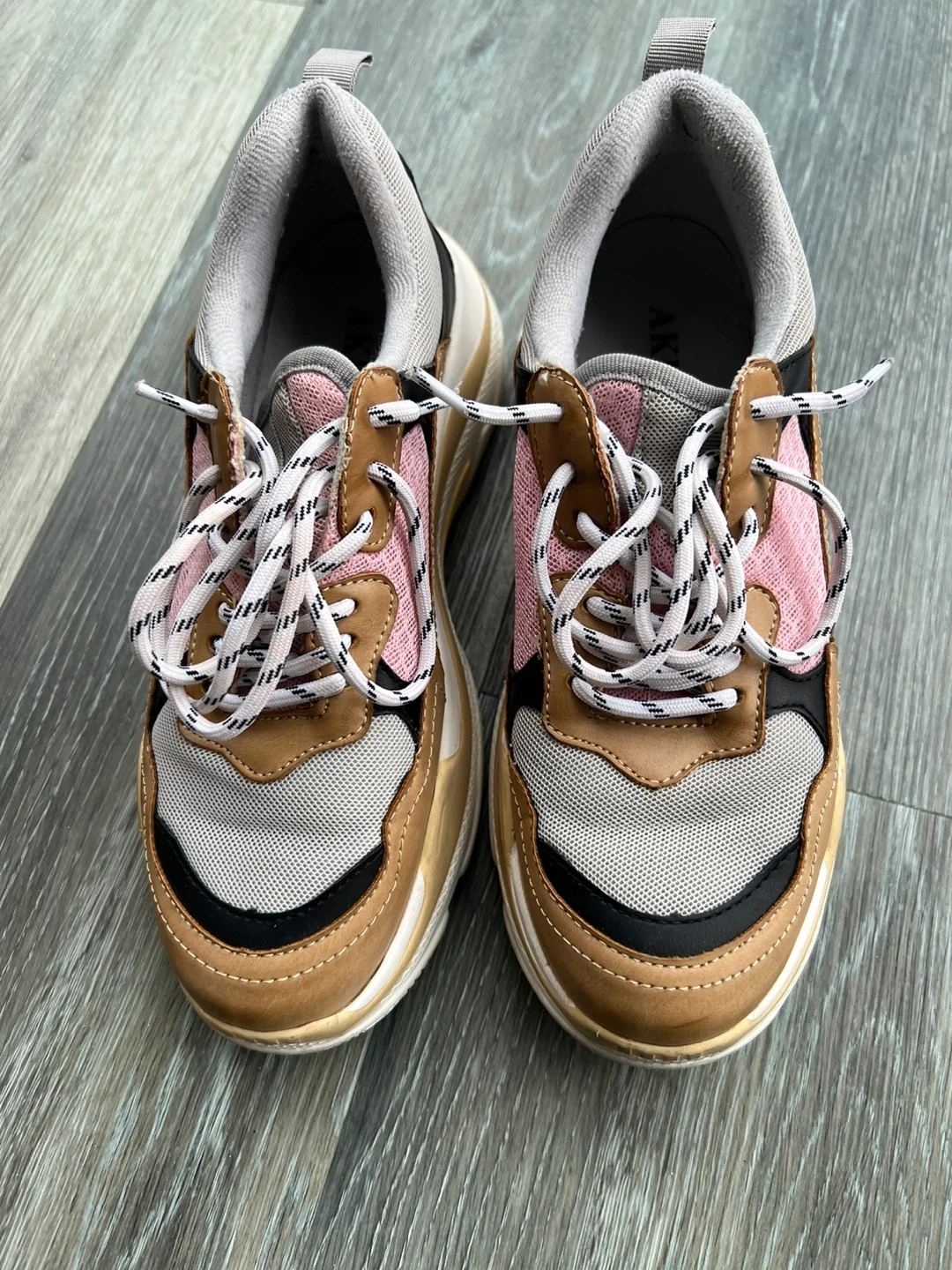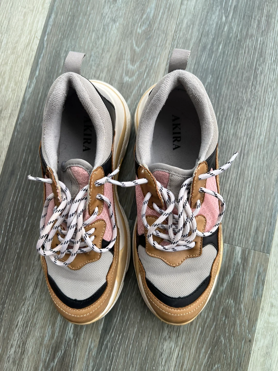15Selling a pair of Akira chunky sneakers in a stylish brown and pink color combination. They're in good condition and ready for a new home! They look like Balenciaga look alike