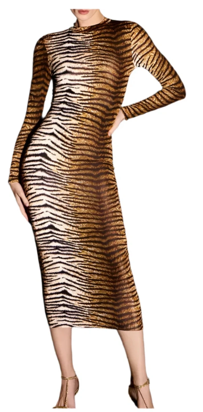This is a Akira dress with a cool tiger print. It's perfect for a night out or a special occasion. The dress features a long-sleeve design and a flattering silhouette. It has a slit in the back.