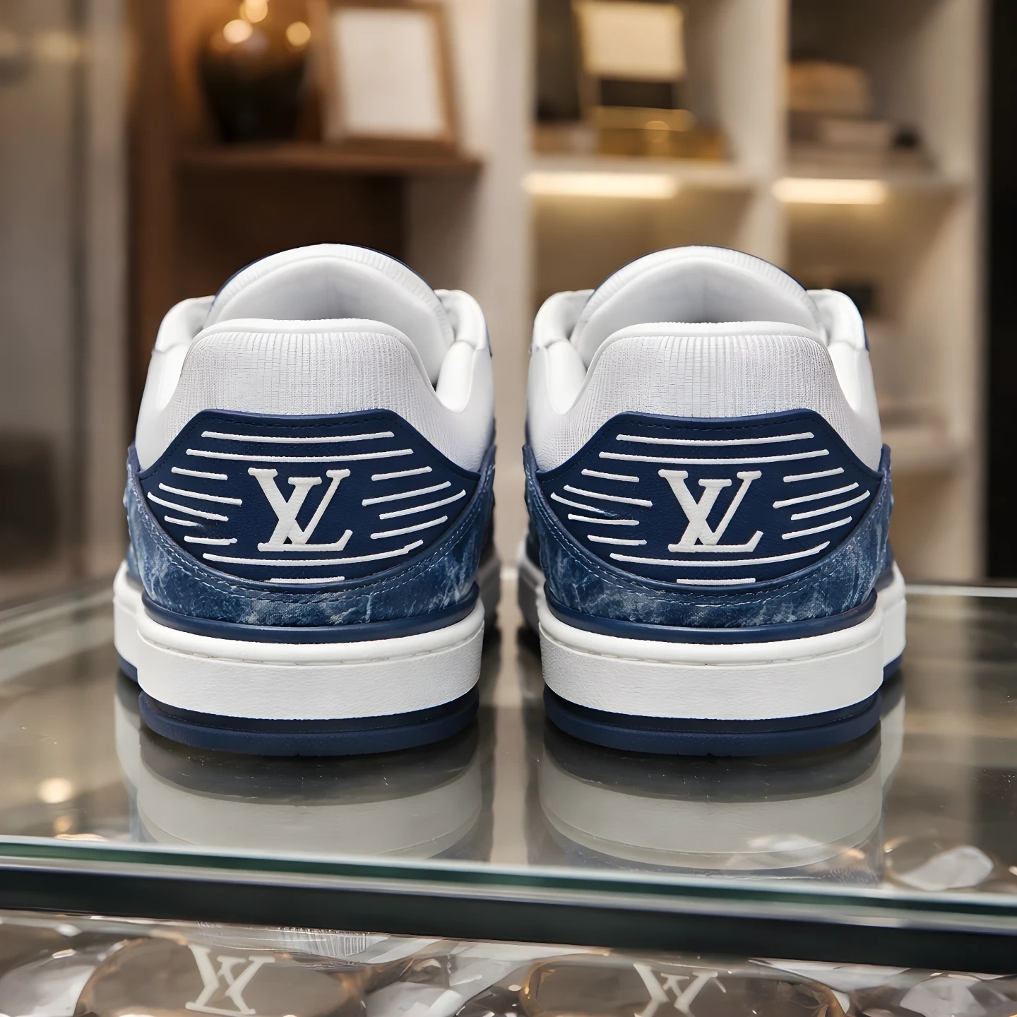 Louis Vuitton LV Trainer sneakers in blue and white. White laces and soles. Features the iconic LV monogram pattern throughout. These sneakers are a stylish choice for any occasion!