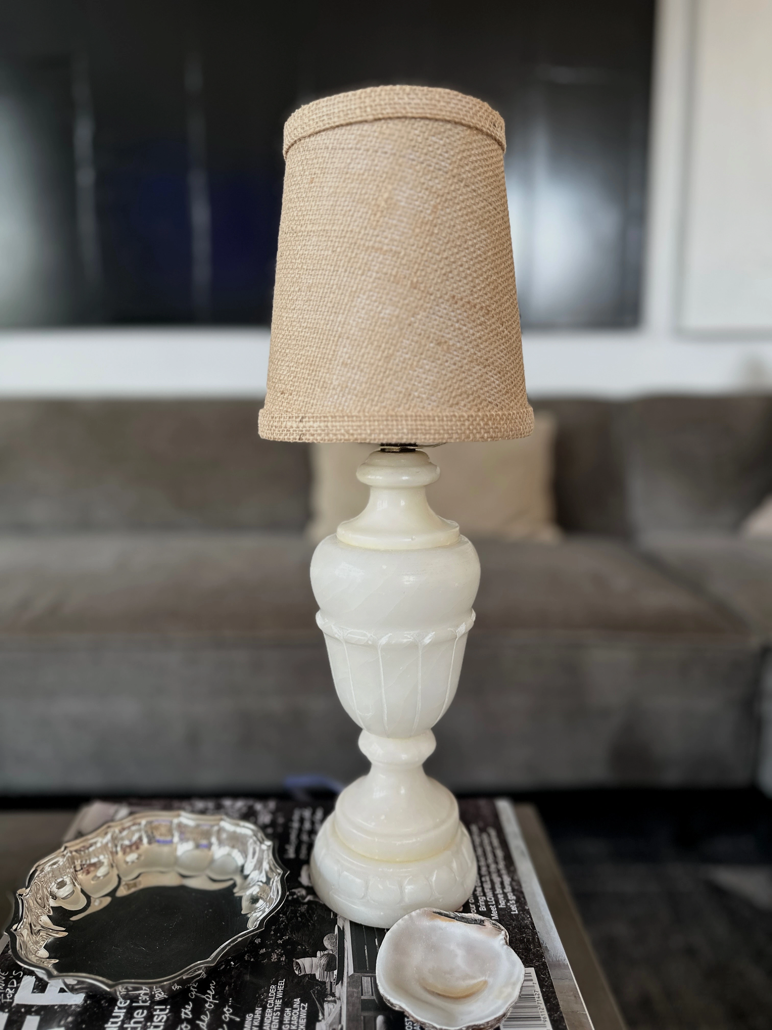 Antique alabaster lamp in amazing shape. Brand new lamp shade included. A harp attachment is also installed if lamp shade would like to be changed in the future. This piece has an ornate body while still being minimal to live within a modern home. Size: 16.5"H x 4.5" Top W x 4" Bottom W