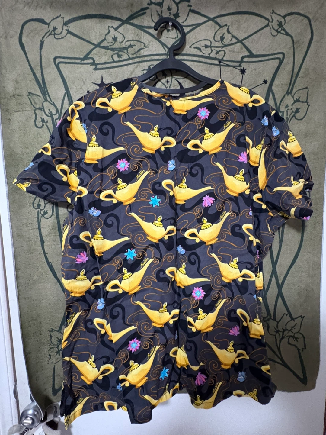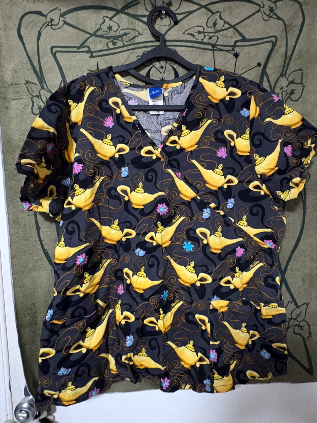 I have a fun Aladdin-themed scrub top for sale! The top is a size medium and features a pattern with the magic lamp, flowers, and butterflies. It's in good condition and perfect for anyone who loves Disney or works in a medical setting