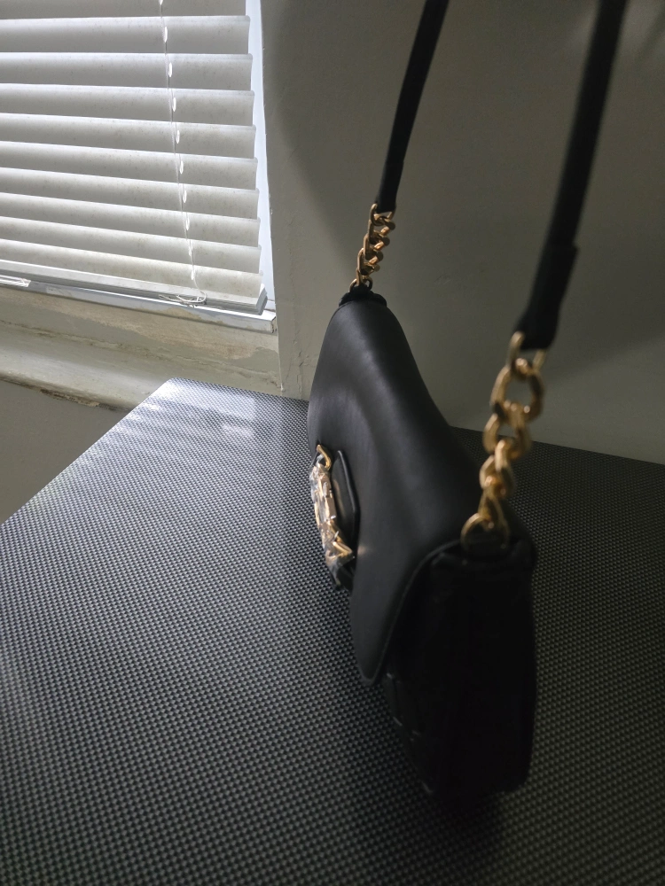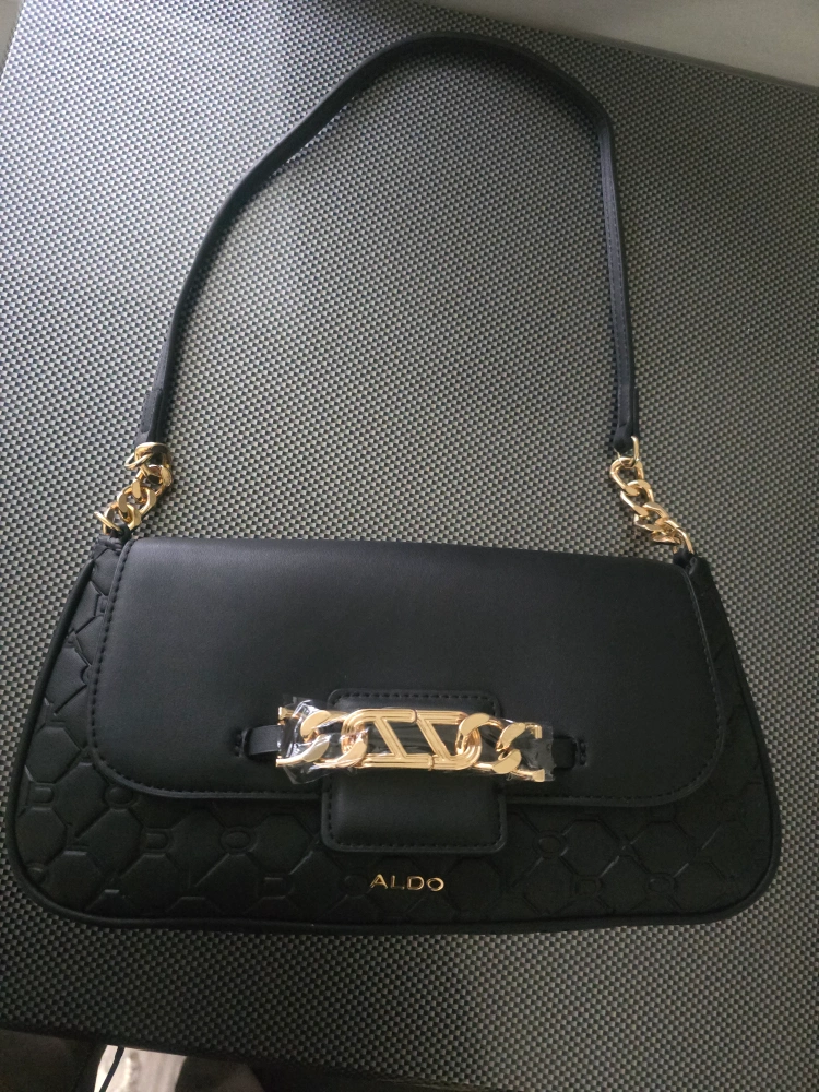 Selling a stylish black shoulder bag from ALDO! It features a gold chain strap and a unique design on the front. Perfect for adding a touch of elegance to any outfit