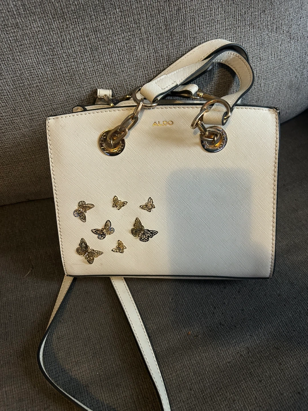 75Cute ALDO satchel in white with butterfly embellishments! It's a stylish bag that's perfect for everyday use. The bag has a handle and a shoulder strap.
