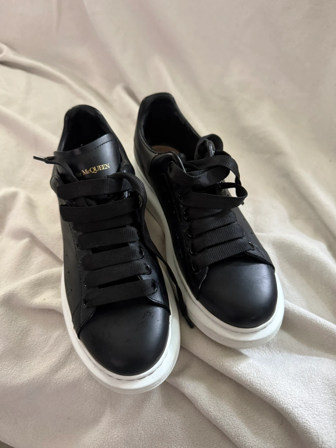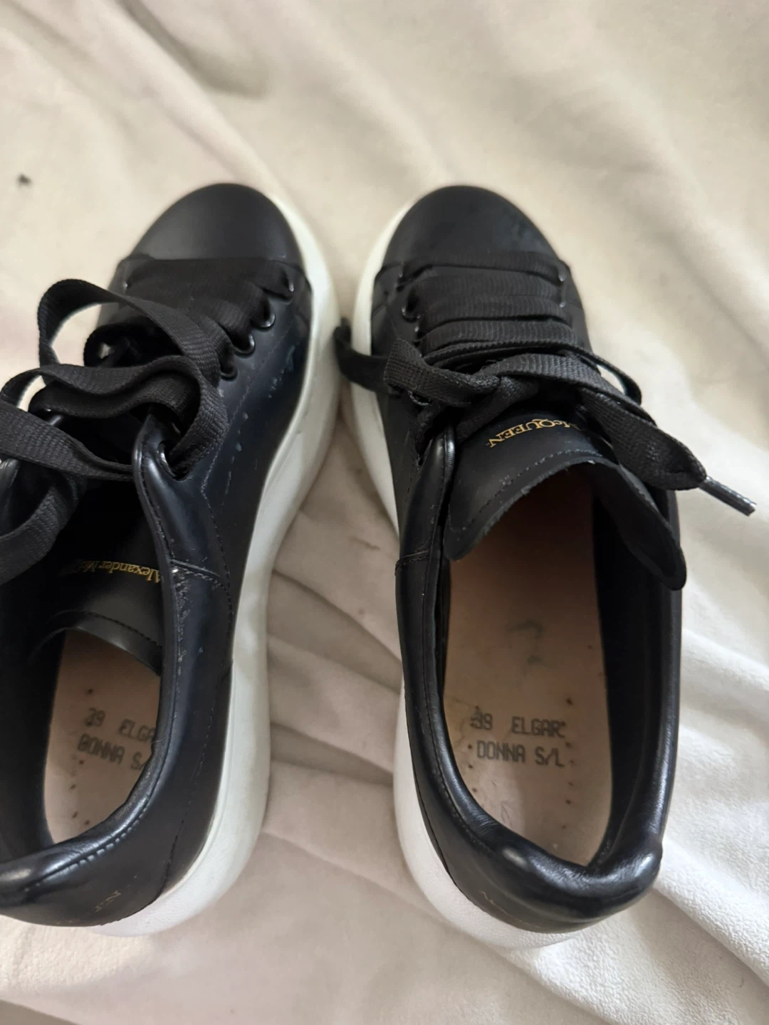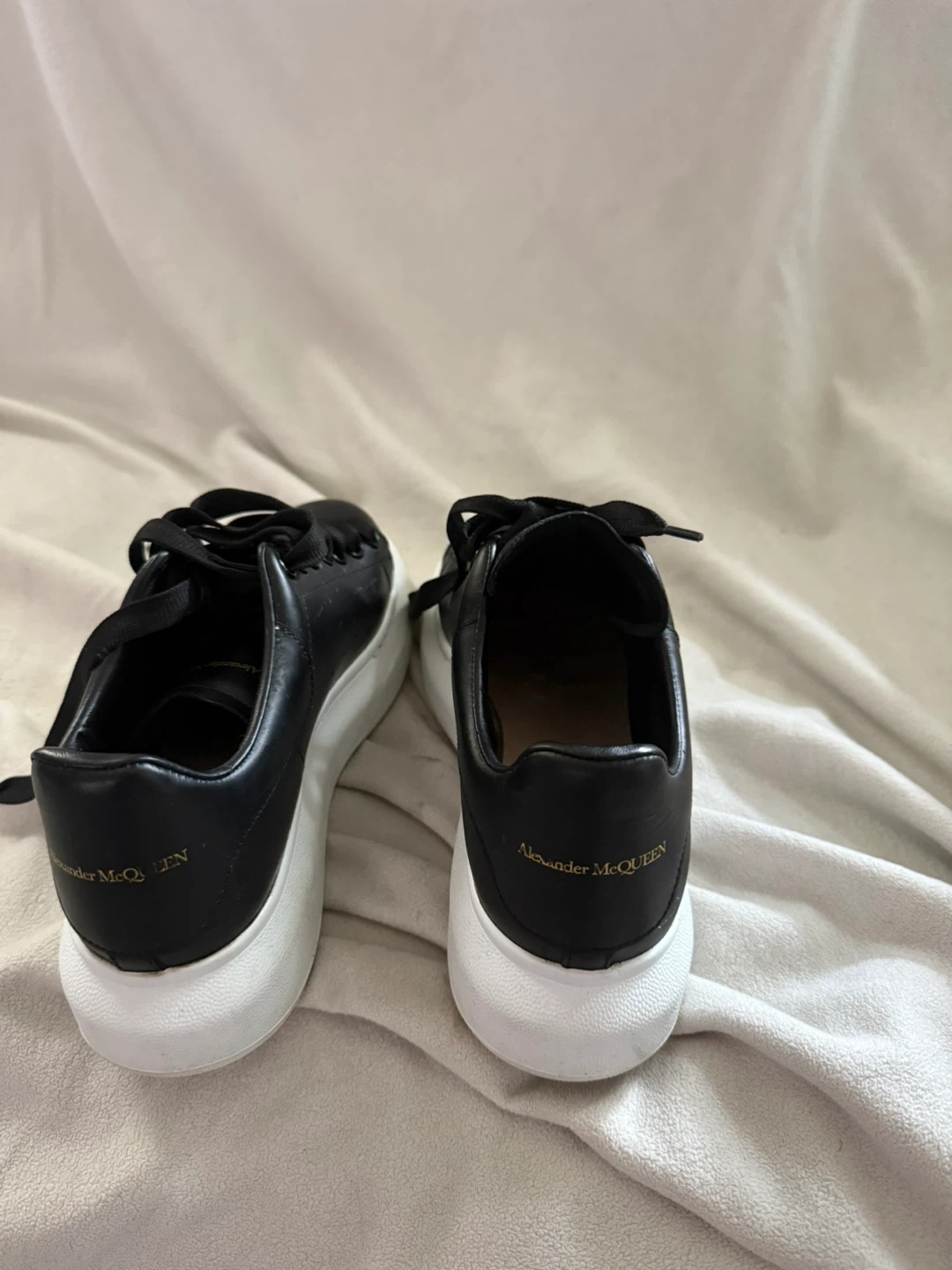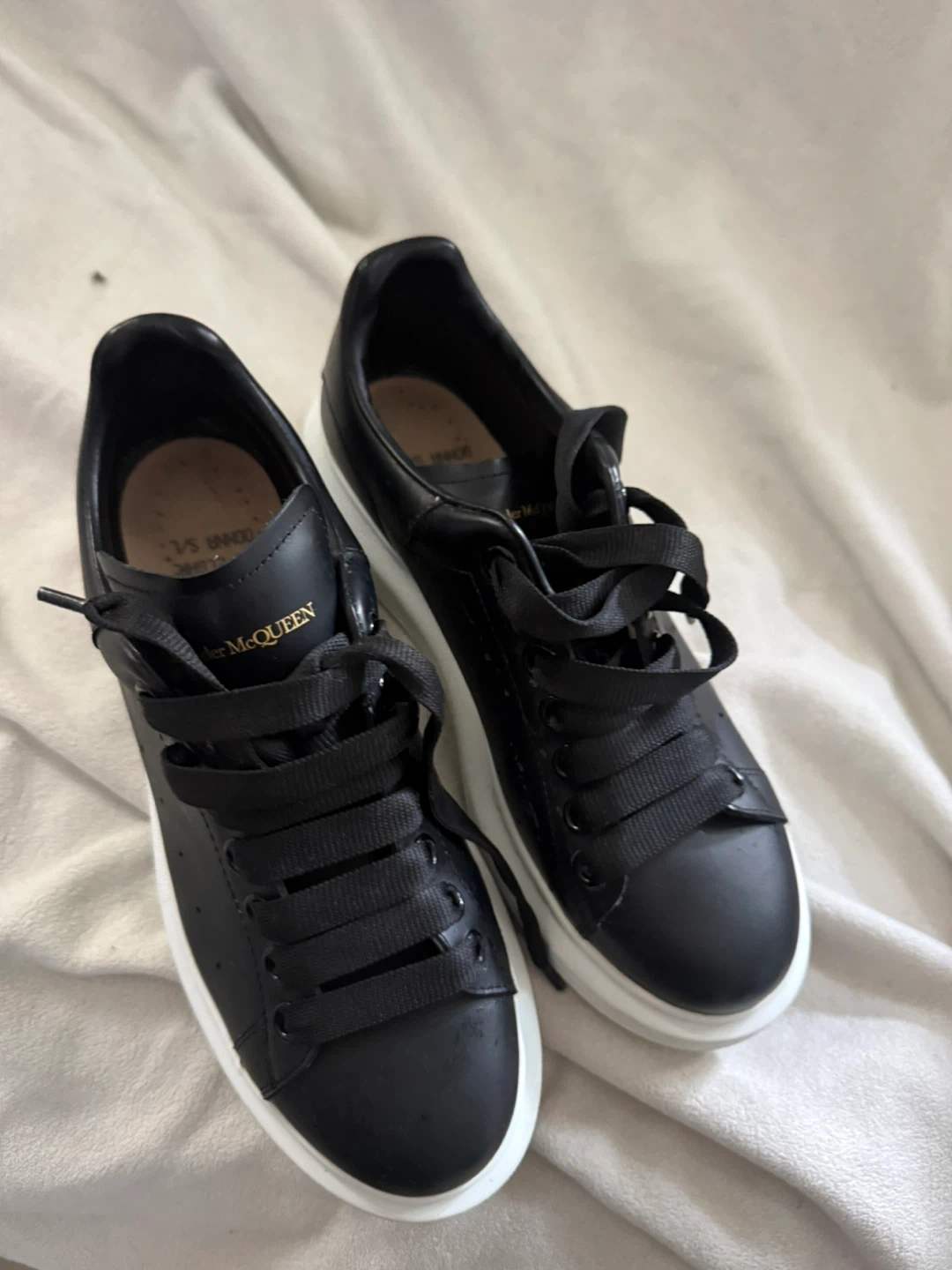 10Selling a pair of Alexander McQueen sneakers in black leather. They are a size 39. Great for adding a touch of edgy style to any outfit!