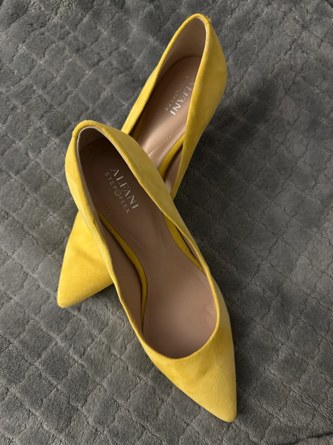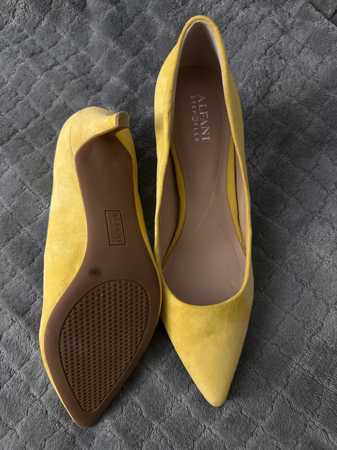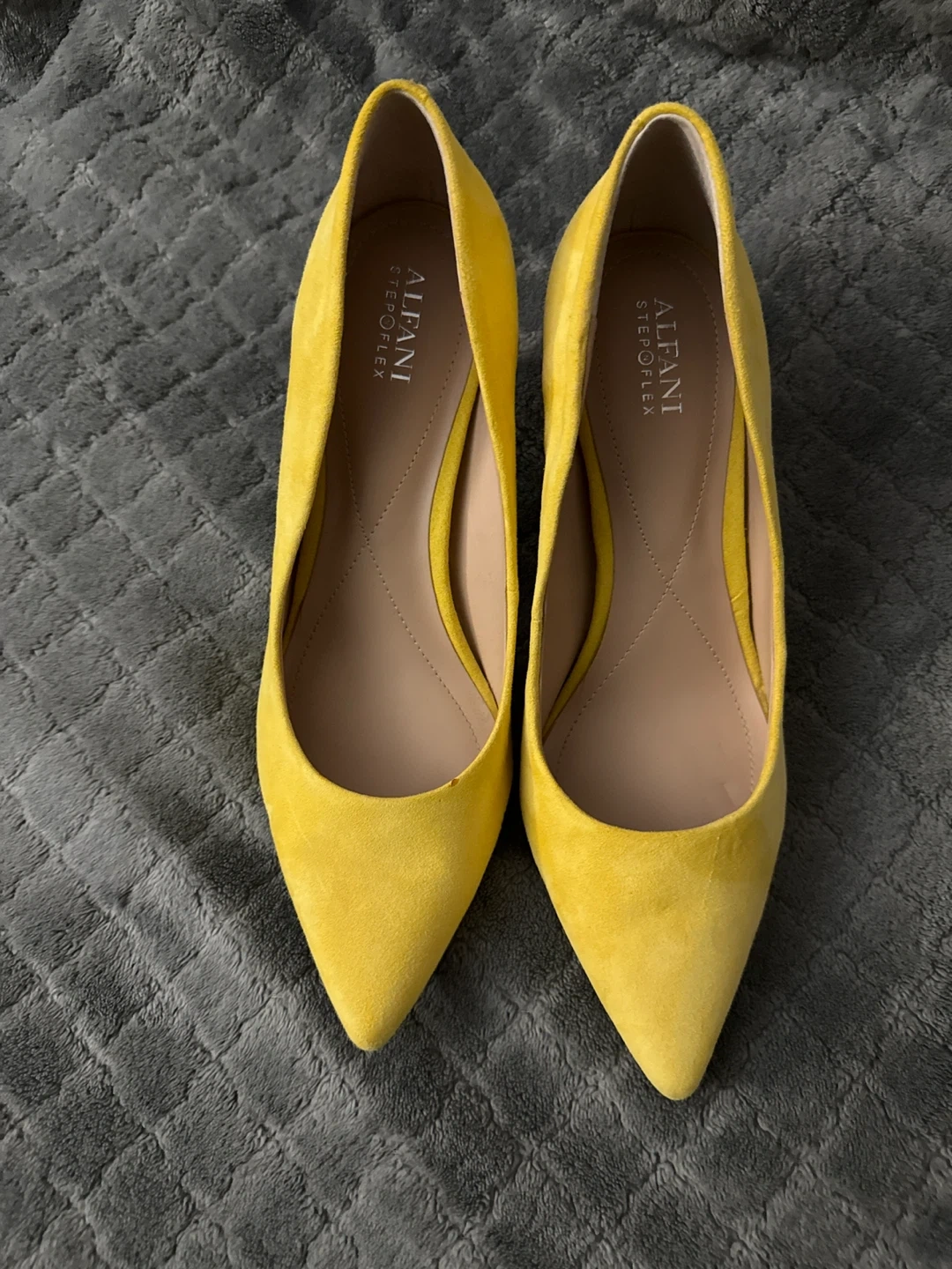 These are a pair of Alfani Stepflex heels in a vibrant yellow color. They are a size 10M. These stylish heels are perfect for adding a pop of color to any outfit!