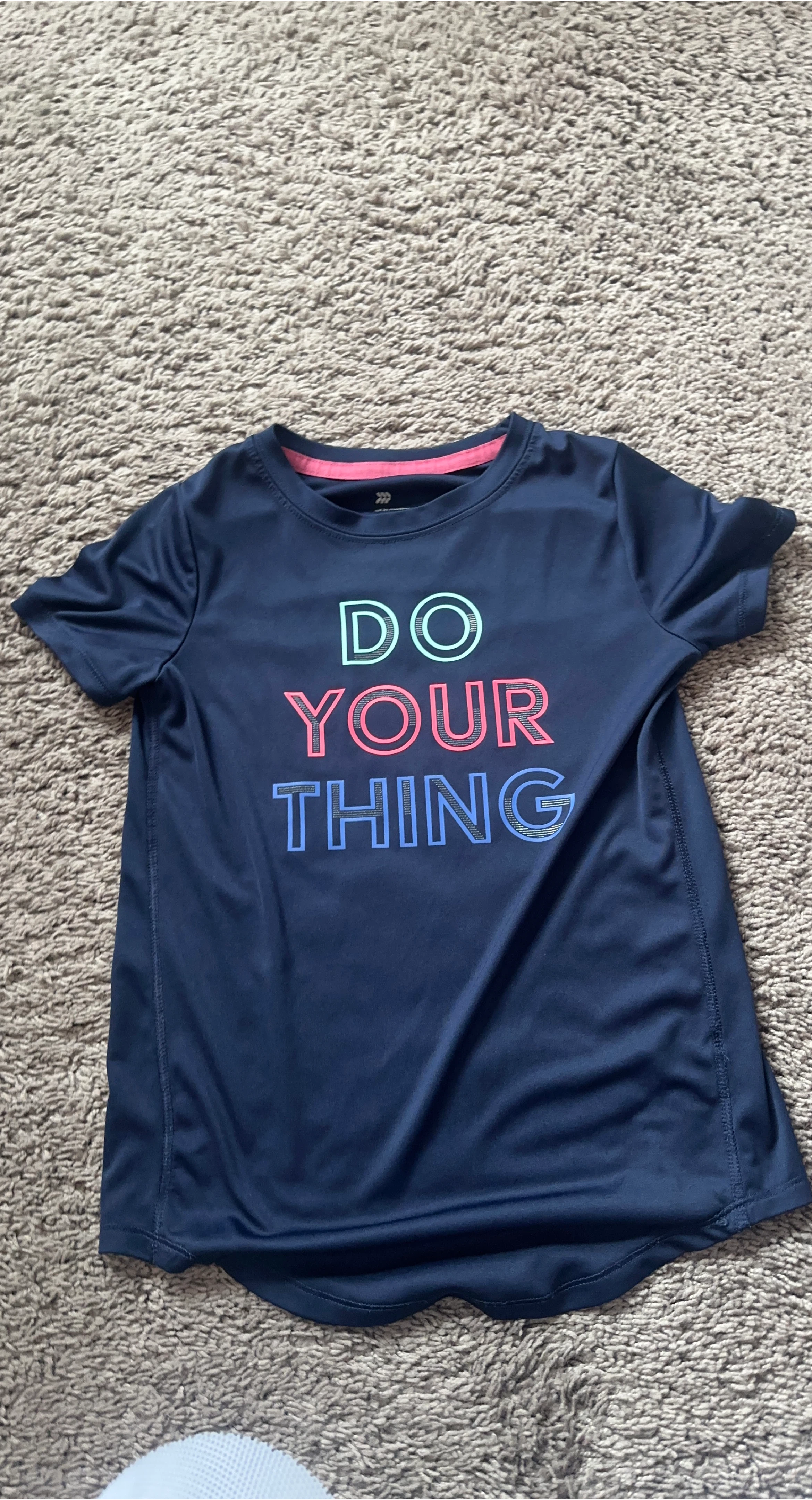 Girls' activewear T-shirt from All in Motion. The shirt is navy blue and has "DO YOUR THING" printed on the front in a layered design with teal, pink, and blue