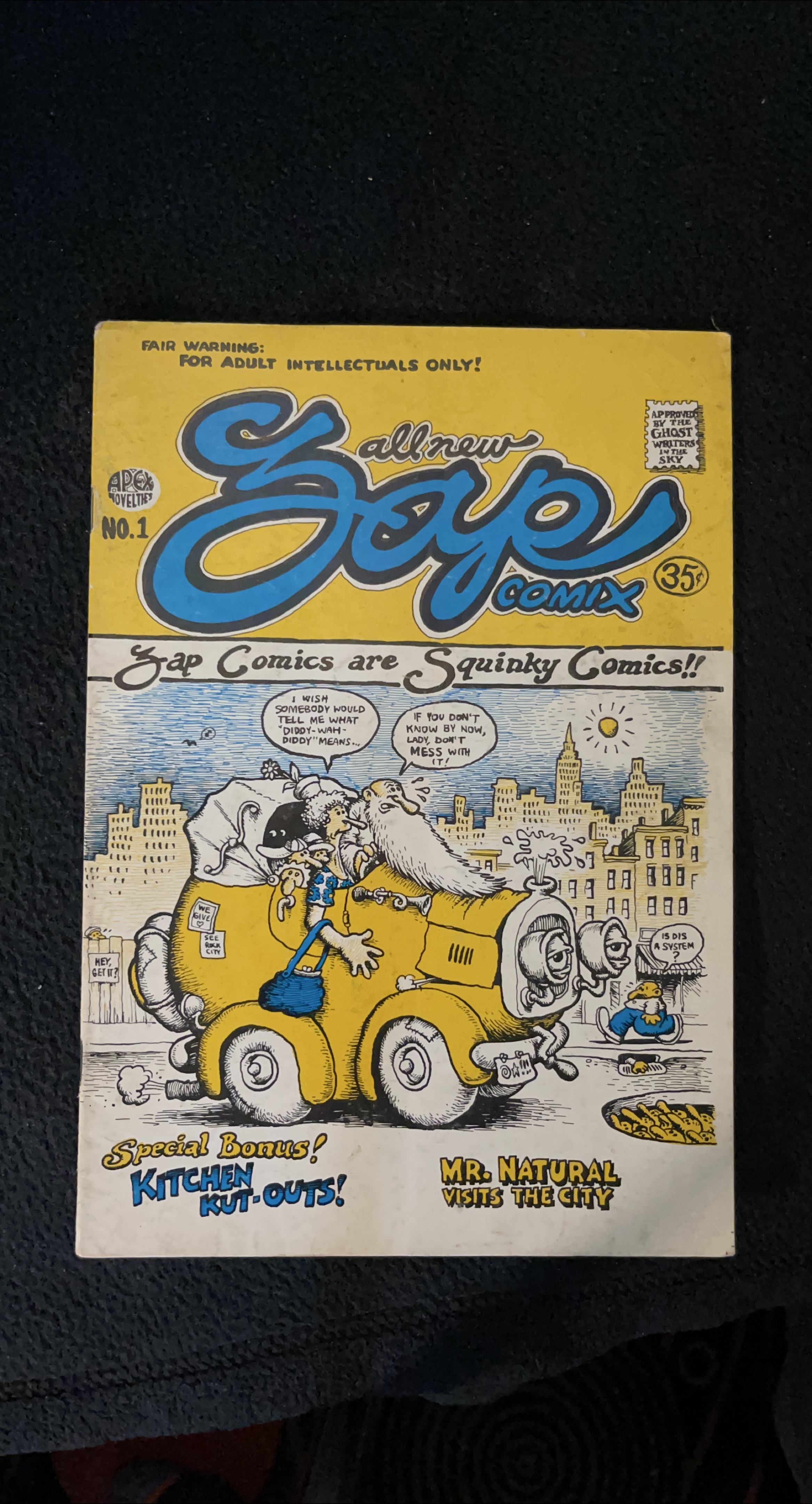 Selling a copy of All New Zap Comix No. 1! It's a vintage comic book, perfect for collectors or anyone who enjoys adult intellectual humor. This edition features 'Mr. Natural Visits the City' and a special bonus of Kitchen Cut-Outs! The cover is yellow and blue with unique illustrations.