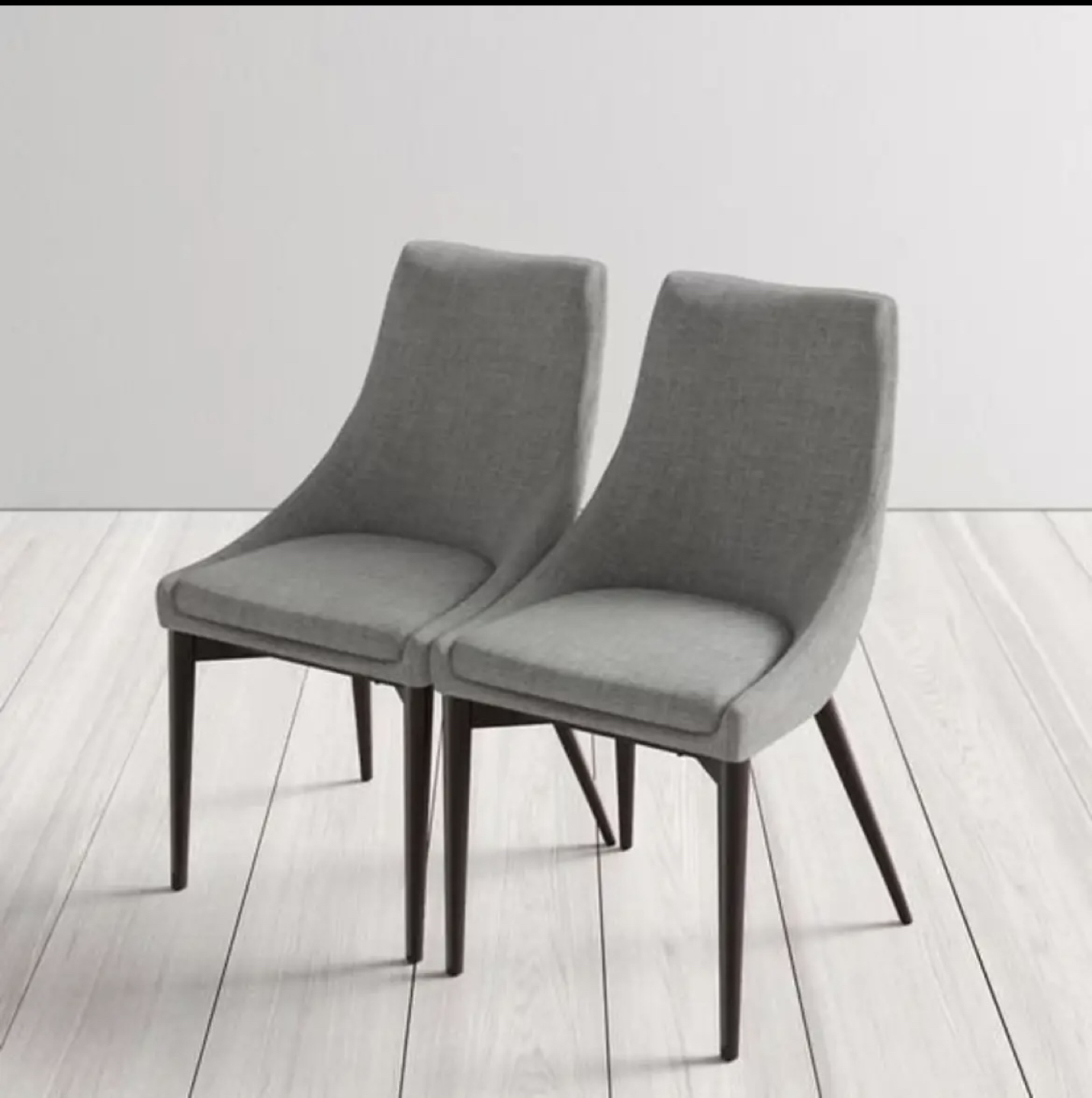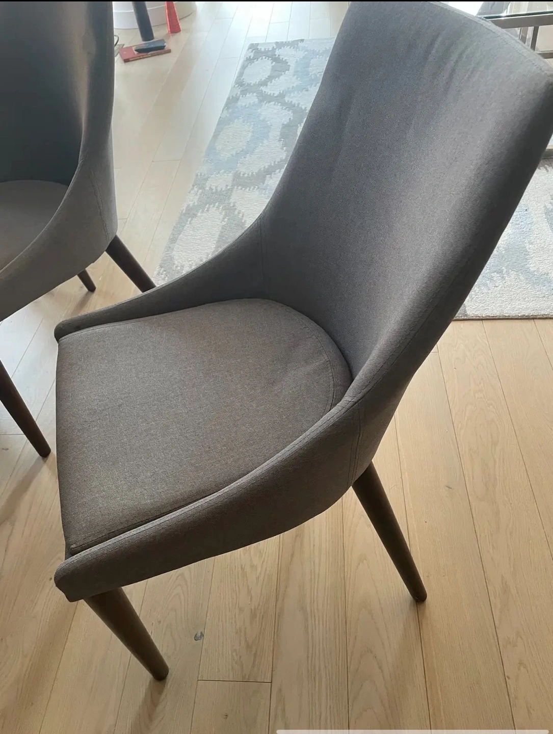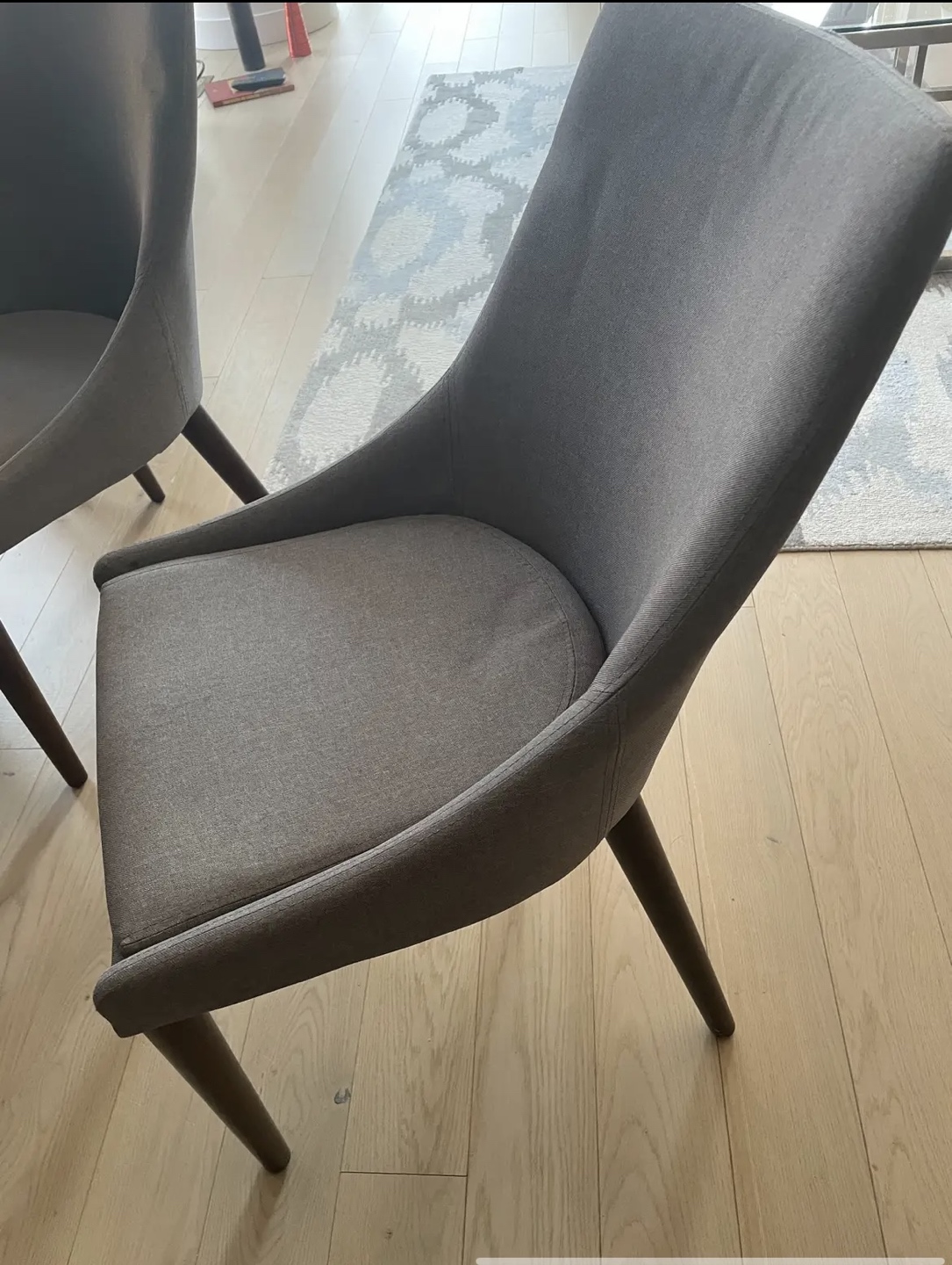 $30 per chair AllModern two (2) grey upholstered dining room chairs with chesnut brown legs. The 2 chairs may be sold separately. 33.5'' H X 19'' W X 24'' D Pick up in Hell’s Kitchen elevator building by Sunday 6/11
