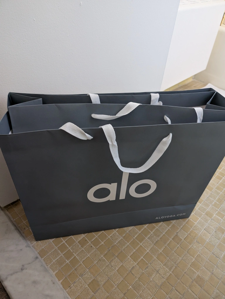 I have an Alo Yoga gray paper shopping bag for sale. It's in great condition and perfect for carrying your Alo purchases or anything else you need to tote around!