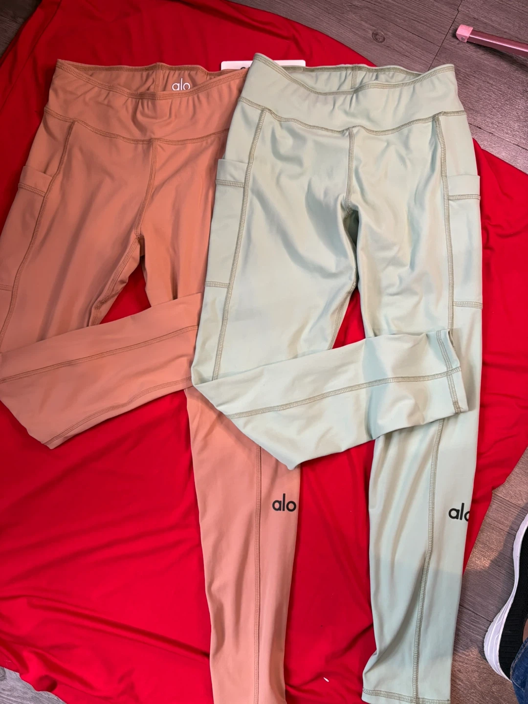 Two pairs of Alo Yoga leggings, both size small! One is a light green color and the other is a tan color. Both are in great condition and have pockets!