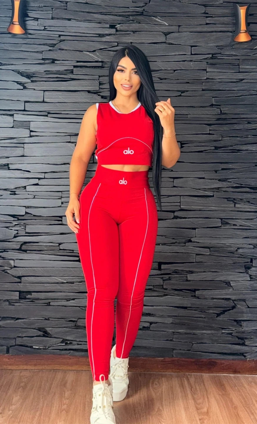 Selling a vibrant red matching set from ALO Yoga! It includes a cropped tank and leggings, both featuring the ALO logo. Perfect for workouts or casual wear