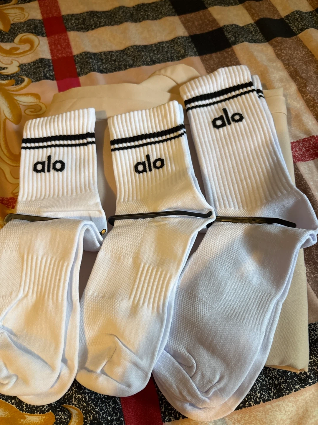 Selling a set of Alo Yoga socks in white! They feature the Alo logo and black stripes at the top. Perfect for workouts or everyday wear