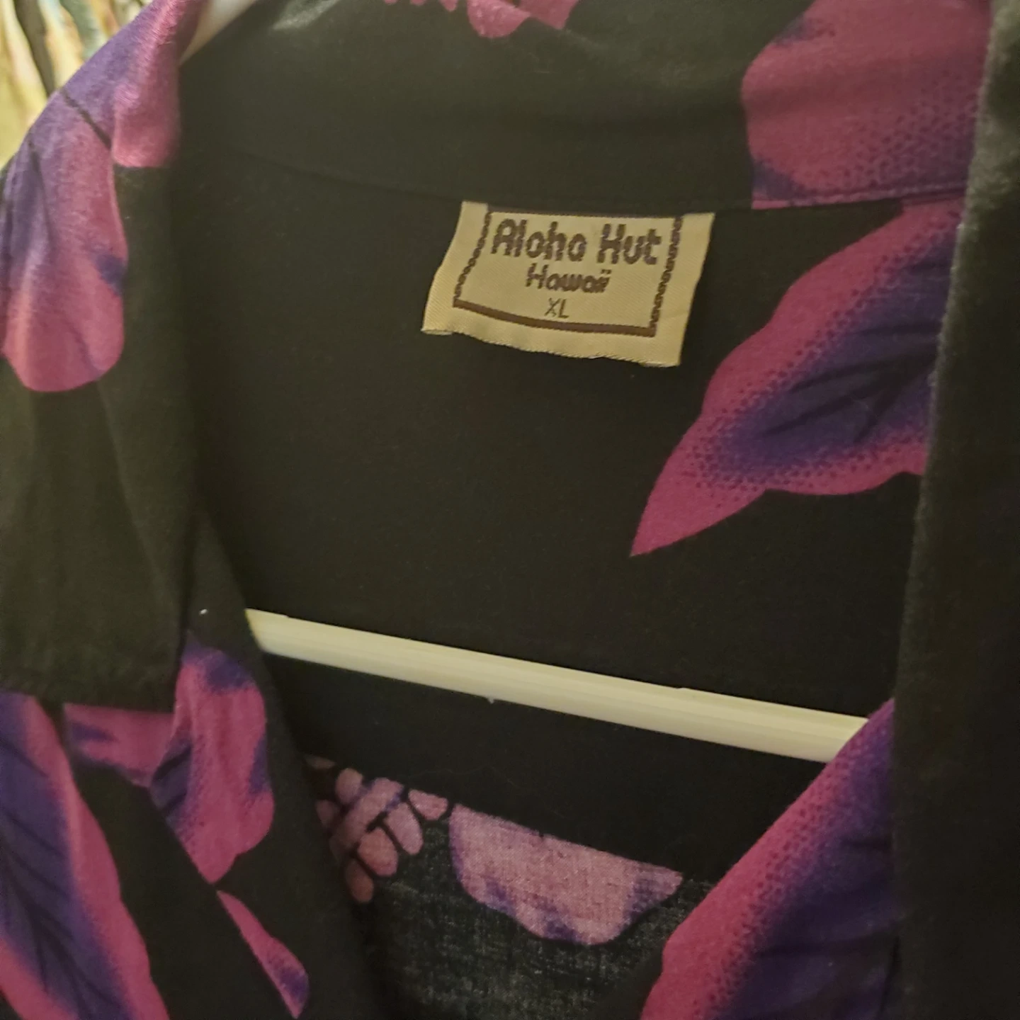 18Selling an Aloha Hut Hawaii shirt in size XL. It features a black background with a vibrant purple floral pattern. Perfect for adding a touch of island style to your wardrobe