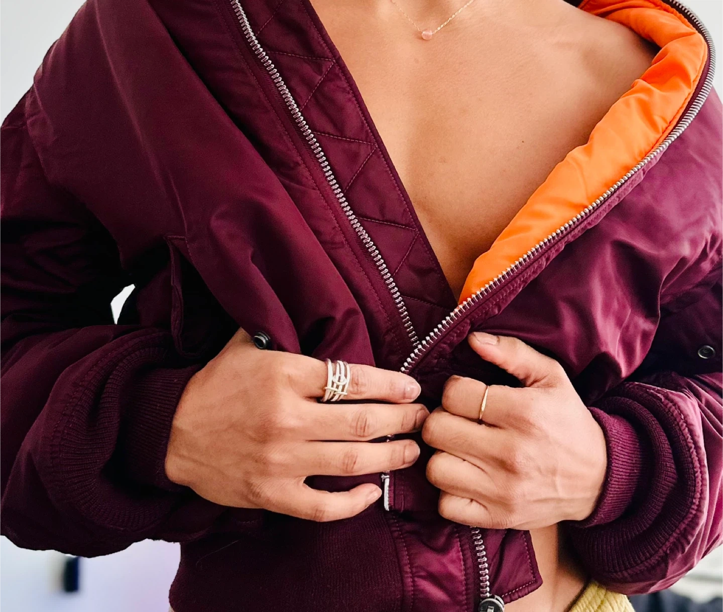 65Selling a stylish burgundy bomber jacket! It's in great condition and ready for a new home. The jacket features a classic bomber design with a zip-up front and ribbed cuffs and hem. Perfect for adding a cool, casual touch to any outfit