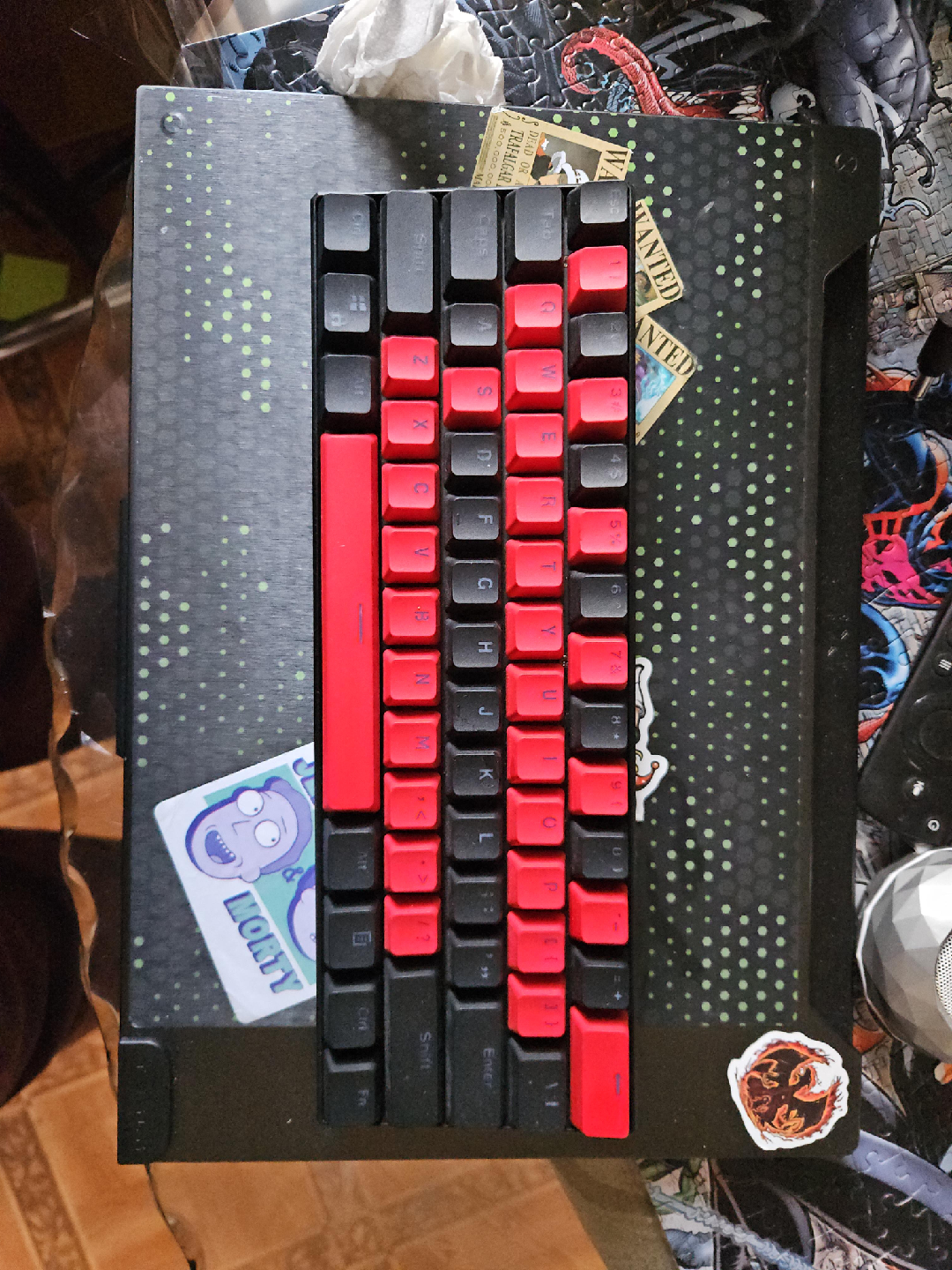 10Selling an Ai Customs keyboard. It features a unique red and black keycap design. Also has RGB lighting will show the different settings for the lighting upon request.