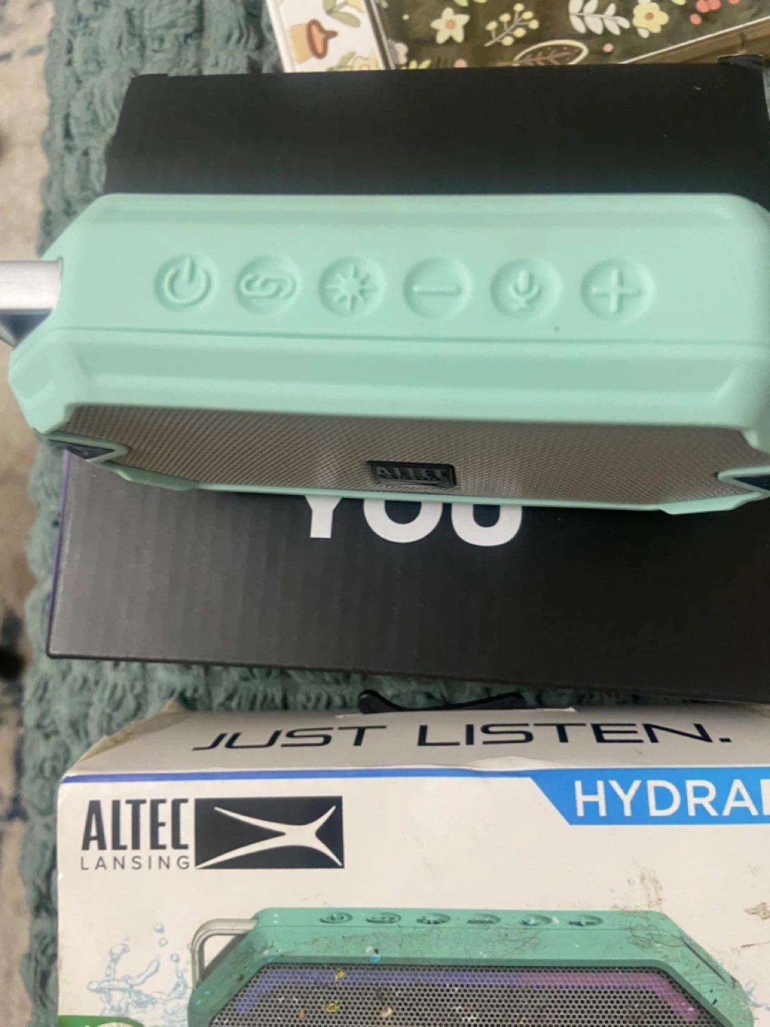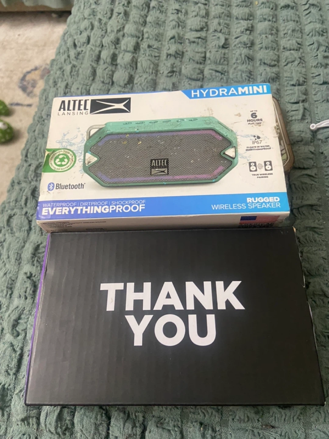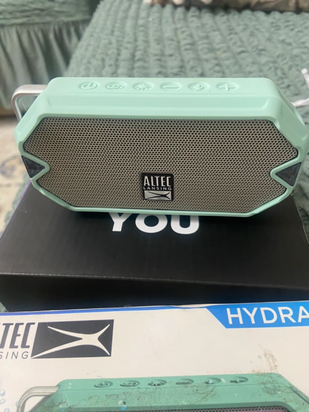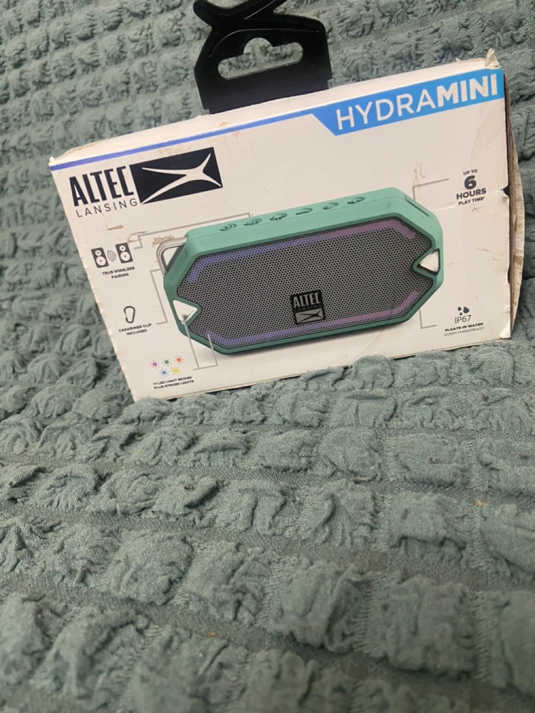 Selling an Altec Lansing Hydra Mini rugged wireless speaker in mint condition! It's waterproof, dirtproof, and shockproof. Enjoy up to 6 hours of playtime. It also floats in water! Comes with a carabiner clip included. Box included