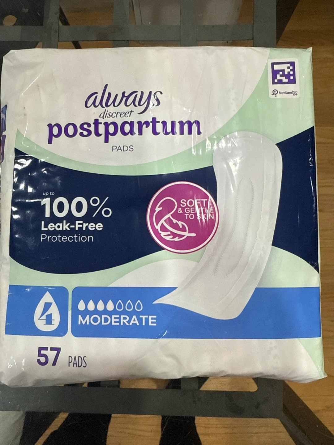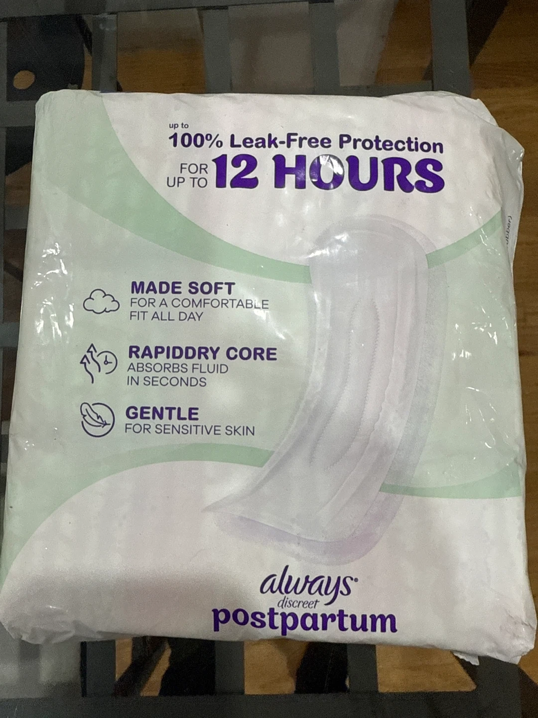70Selling a pack of Always Discreet Postpartum Pads. This package contains 57 pads, offering up to 100% leak-free protection for up to 12 hours. They're designed to be soft and gentle on the skin, with a rapid dry core that absorbs fluid in seconds