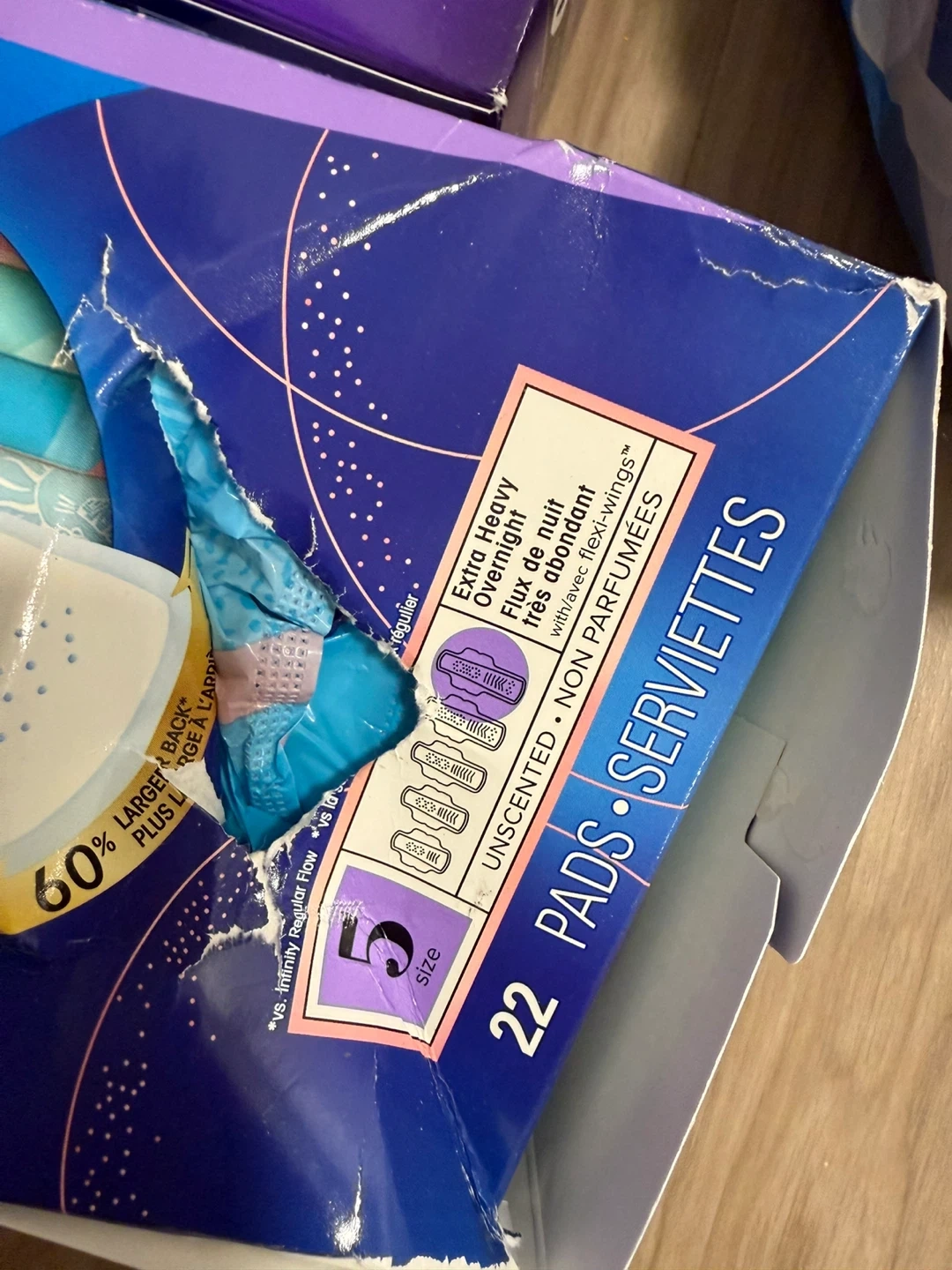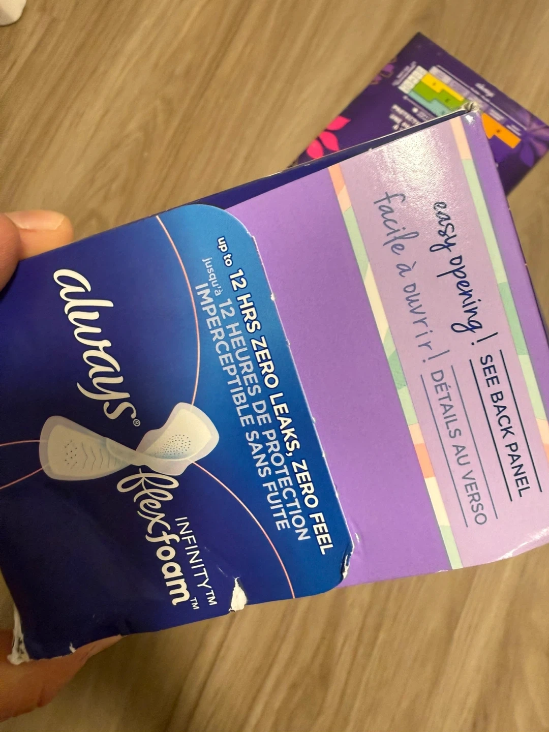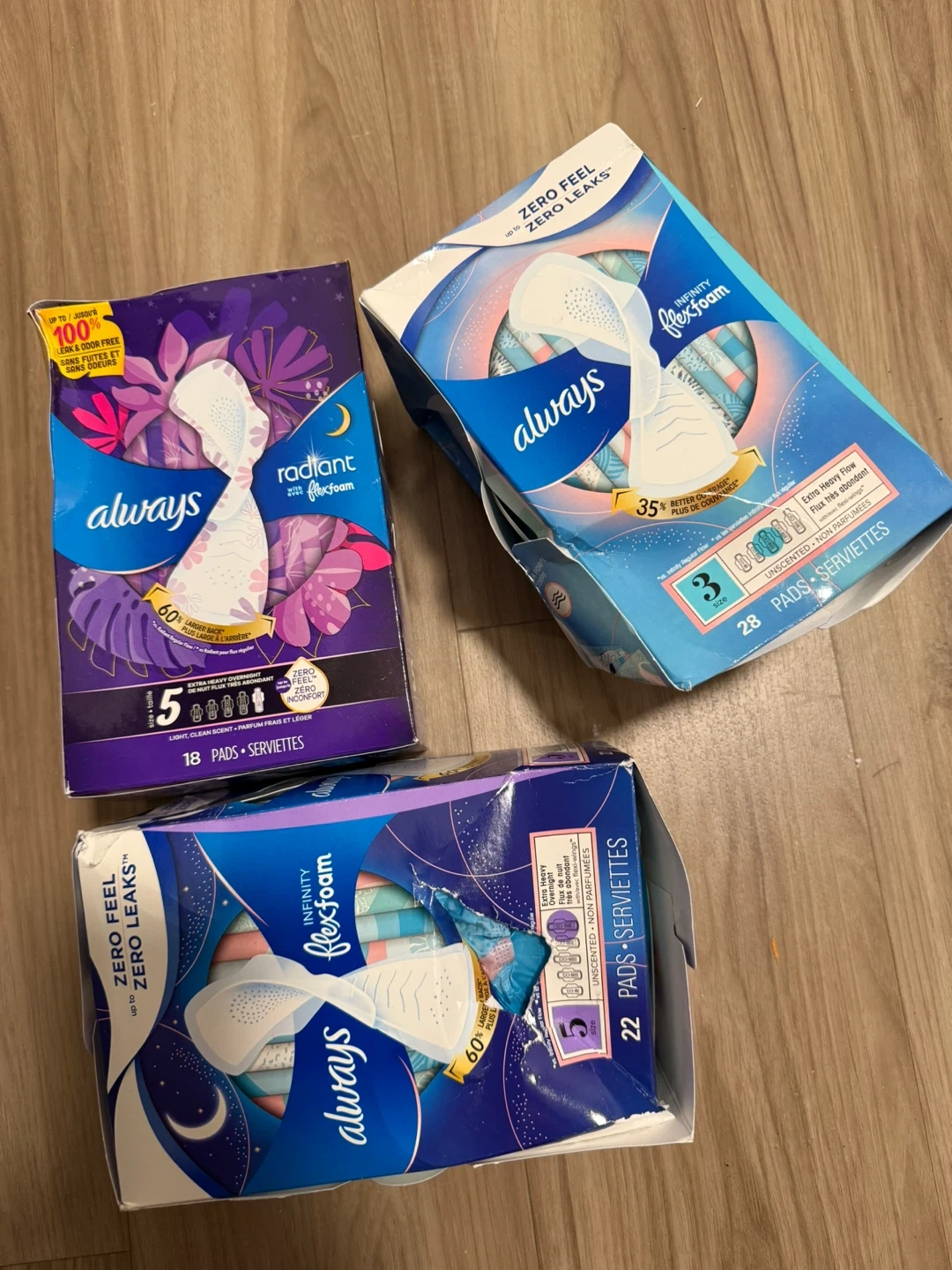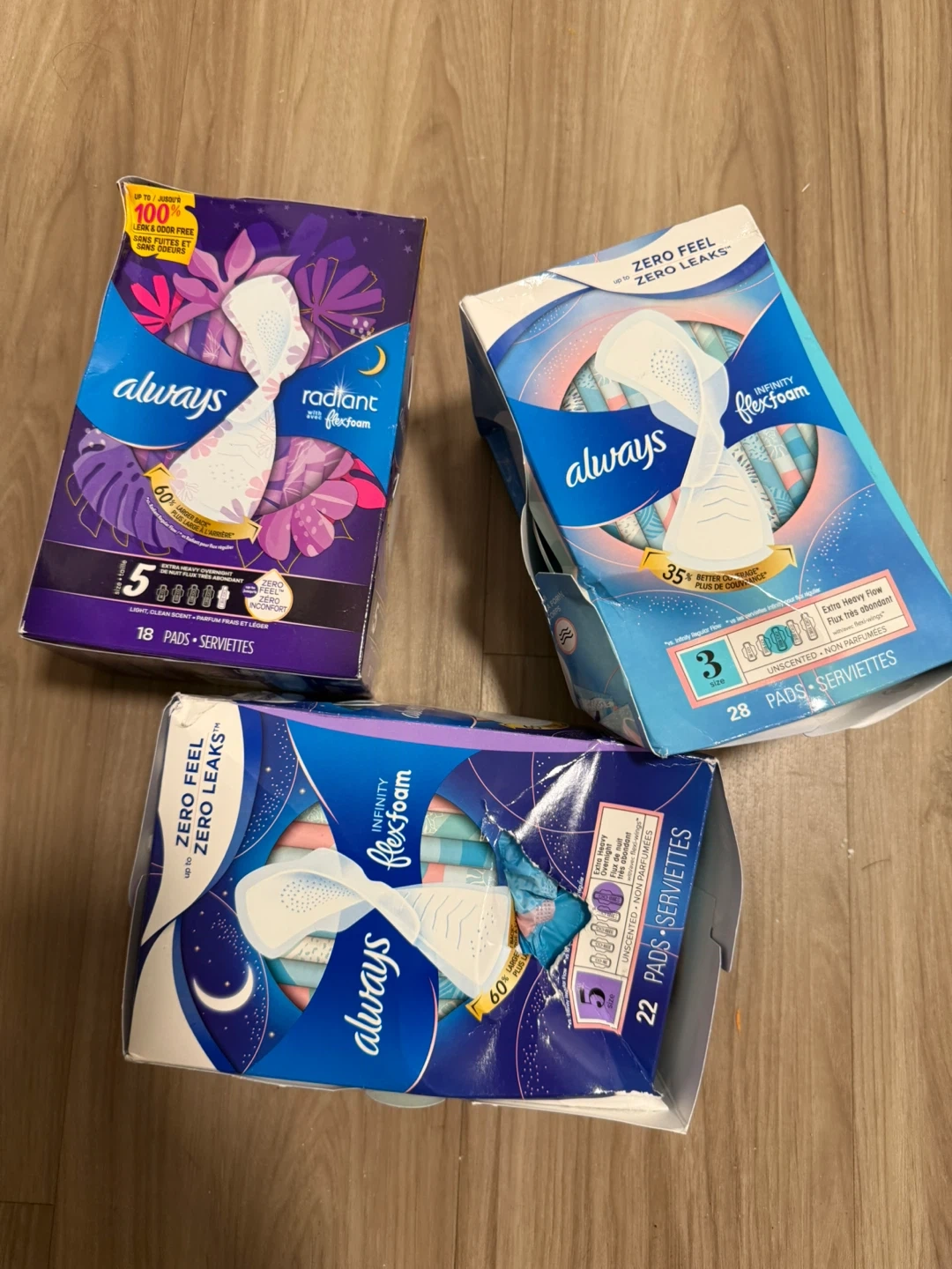 I have a mix of Always Radiant and Infinity FlexFoam pads available. The Radiant pads are 18 count. The FlexFoam pads come in counts of 22 and 28. They are unscented and come in size 5. The manufacturing date is 2025 April 25