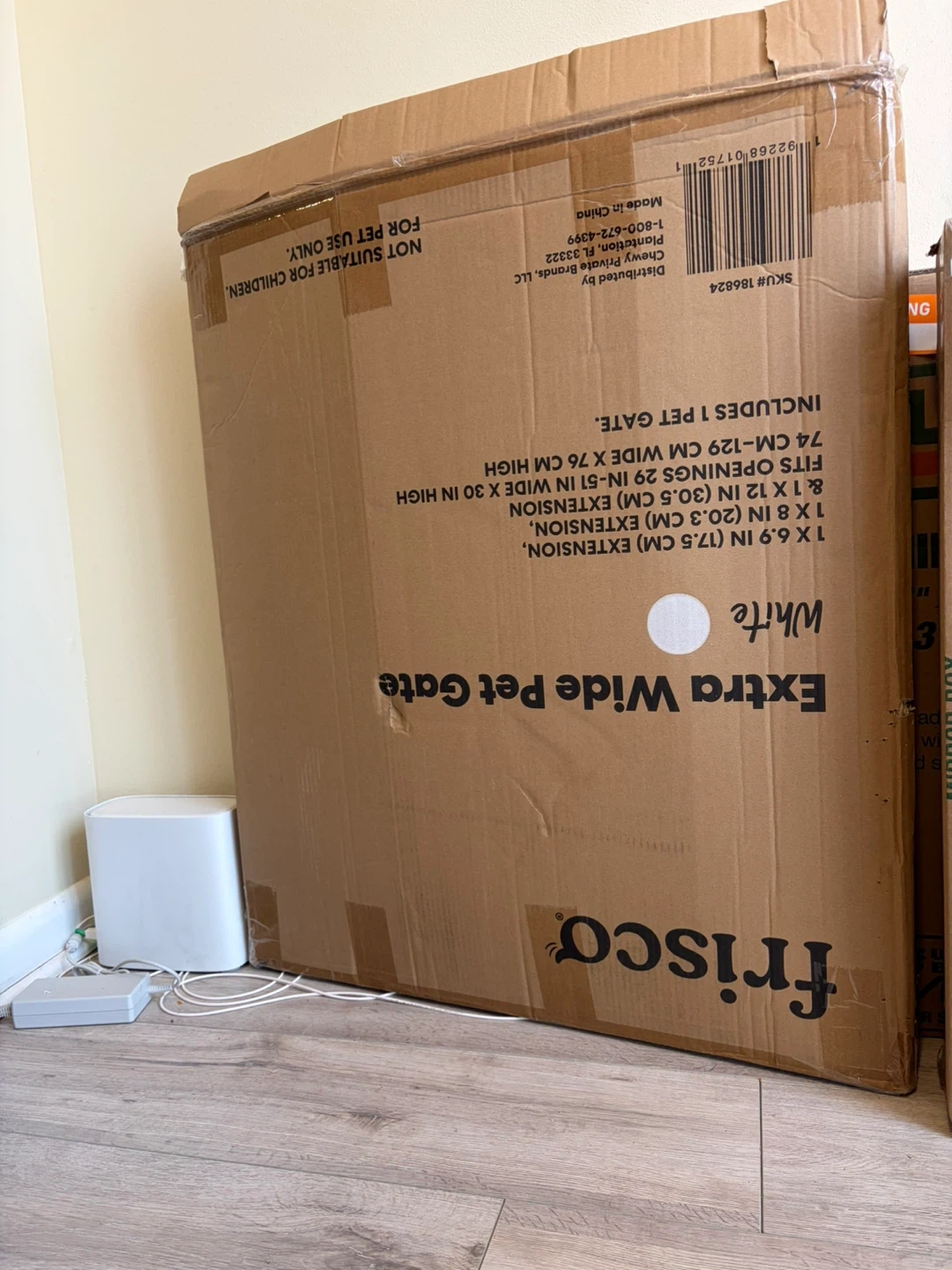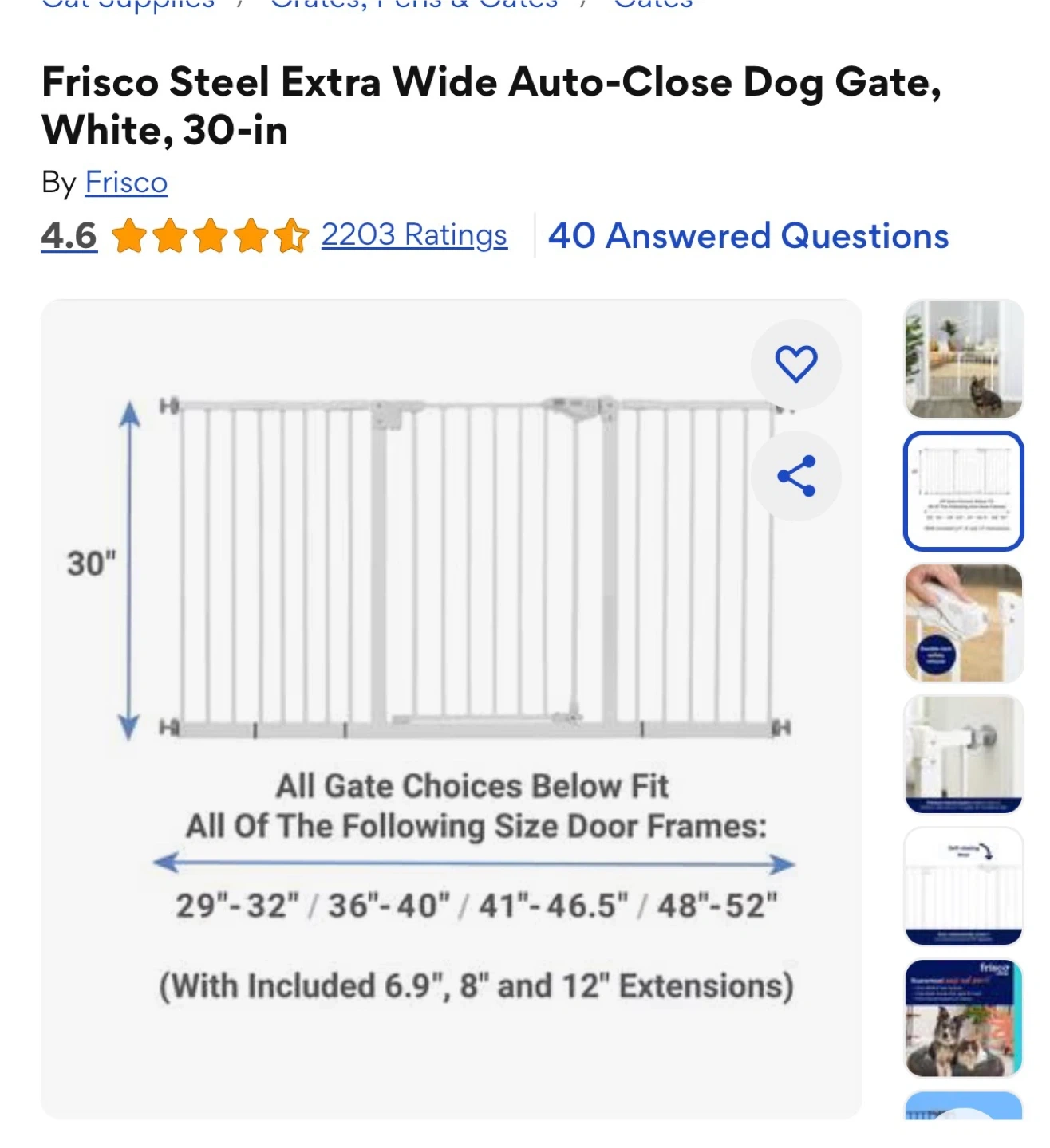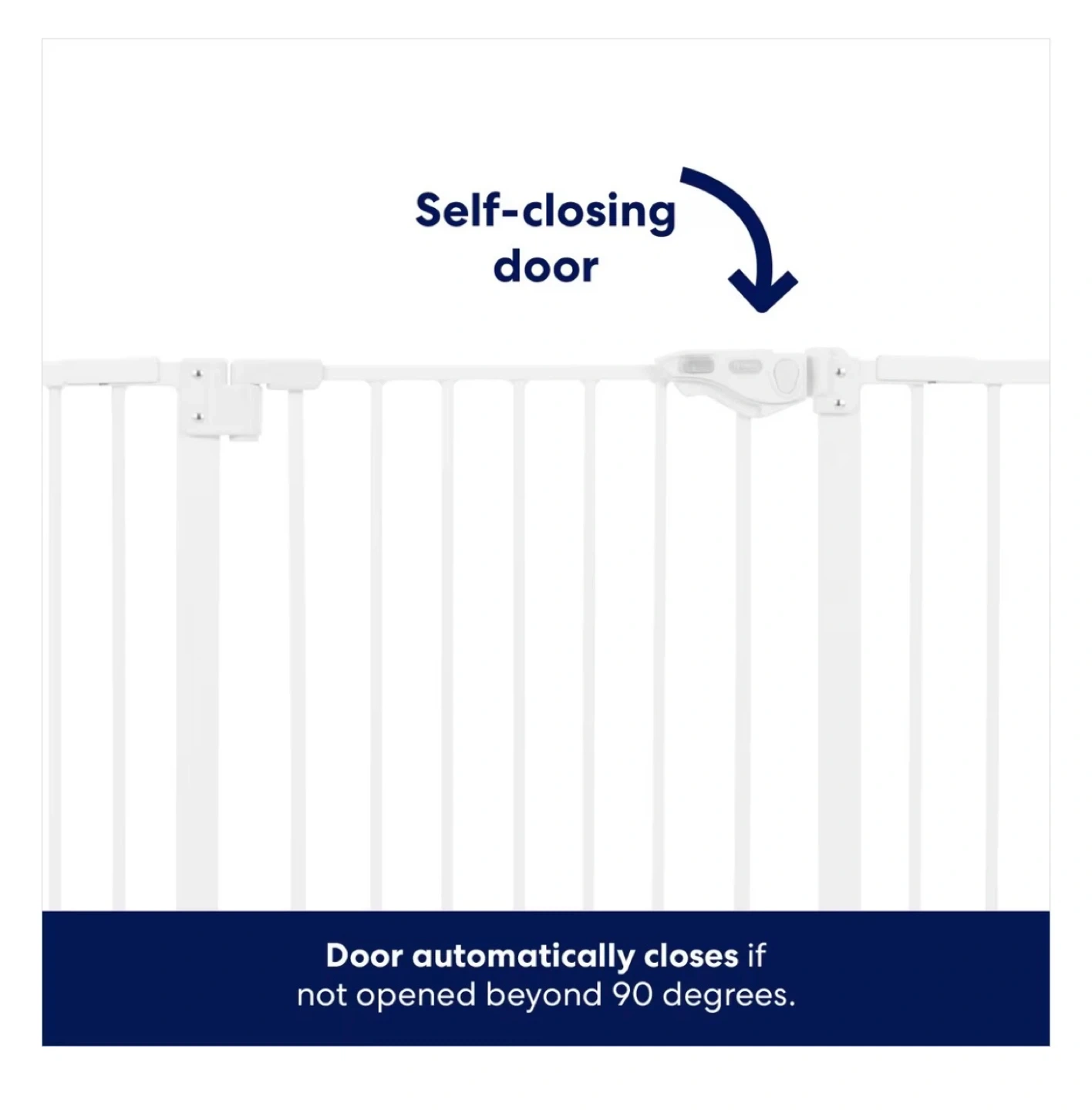 This Frisco steel pet gate is extra wide and features an auto-close door. It's 30 inches tall and fits openings from 29" to 32". Includes 6.9", 8", and 12" extensions for wider openings. The door automatically closes if not opened beyond 90 degrees. It's perfect for keeping pets safely contained!