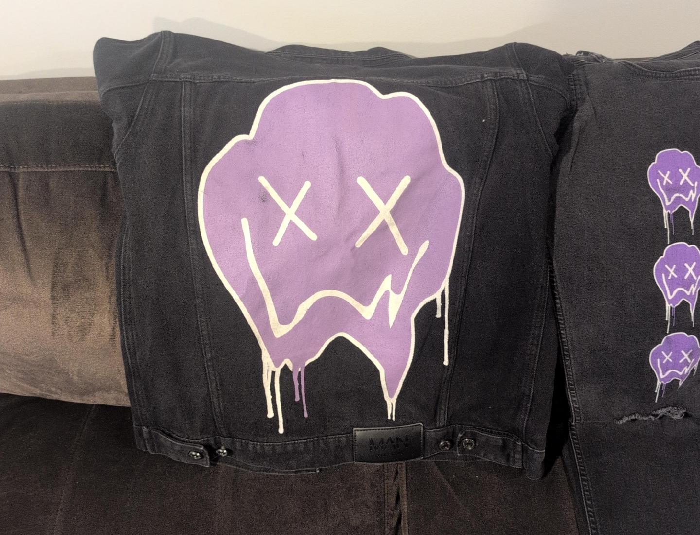 Selling a black denim jacket from AMAN Union. It features a cool purple graphic on the back. Great for adding some edge to your outfit! Size M jacket size 32 pants