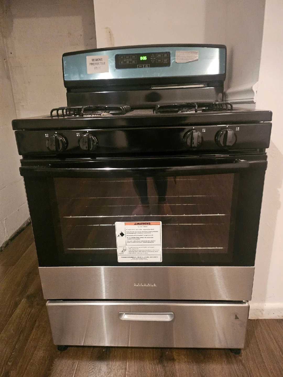 72Selling a black gas range oven. It has a stovetop with four burners and an oven with racks. The digital display is still covered with the protective film. Great for cooking your favorite meals! brand new never used, most pick up.