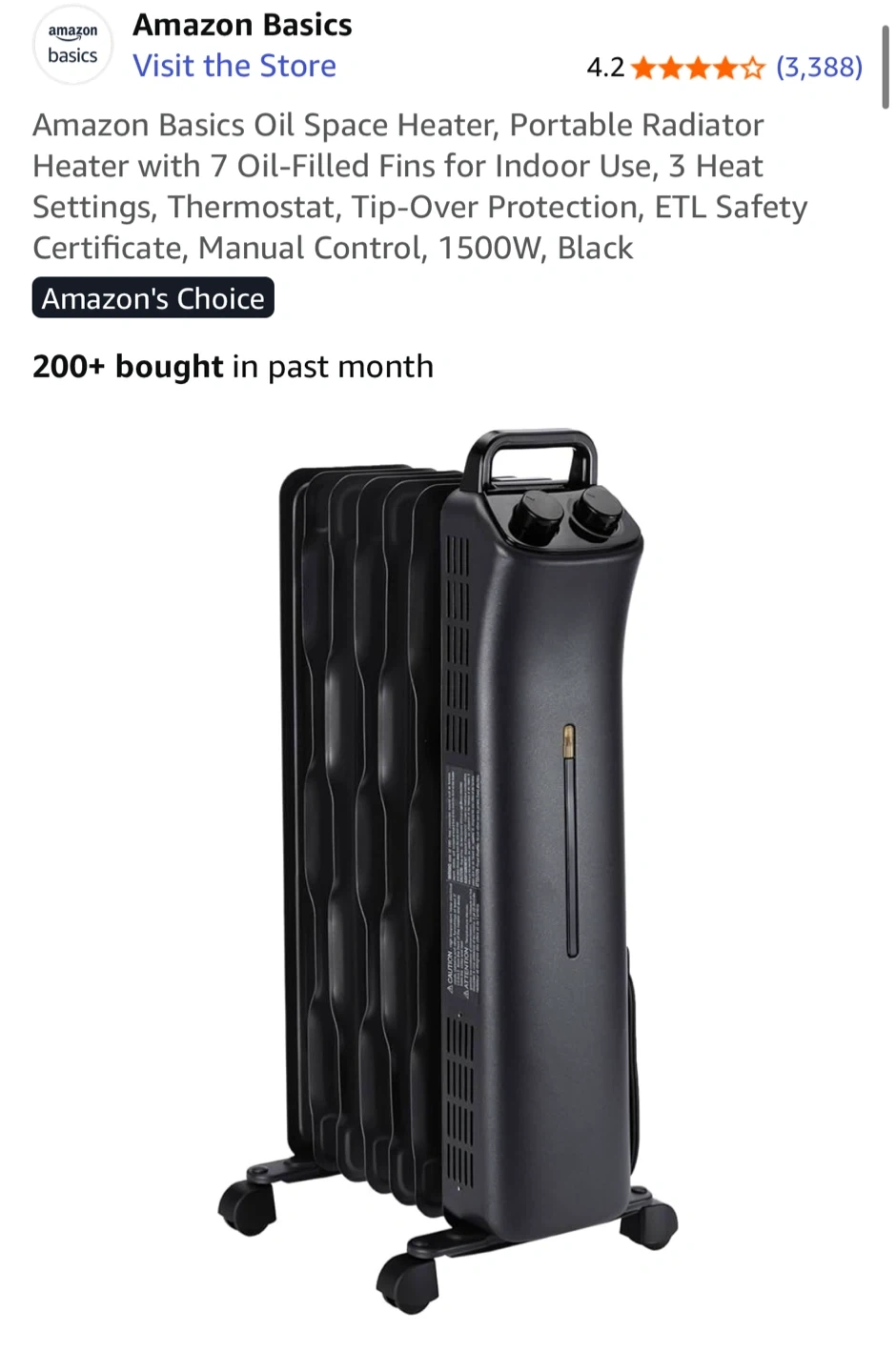 Selling an Amazon Basics oil space heater in black. It's a portable radiator heater with 7 oil-filled fins, perfect for indoor use. It has 3 heat settings, a thermostat, tip-over protection, and manual control. It's also ETL safety certified and 1500W