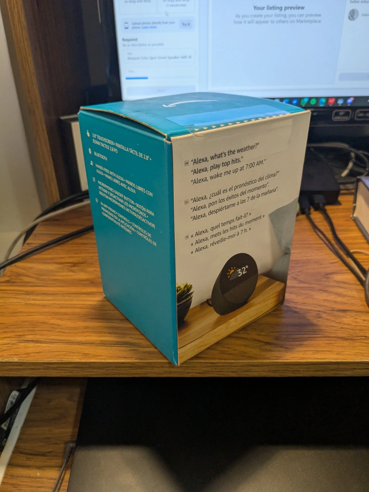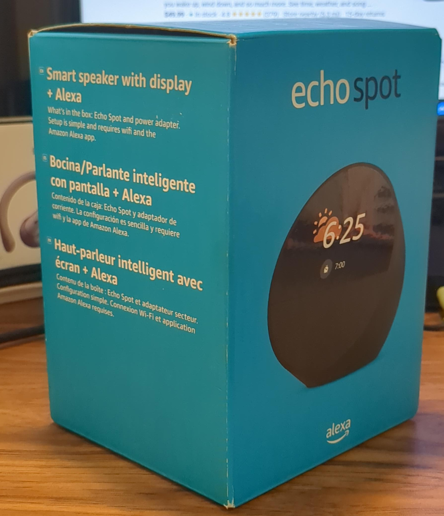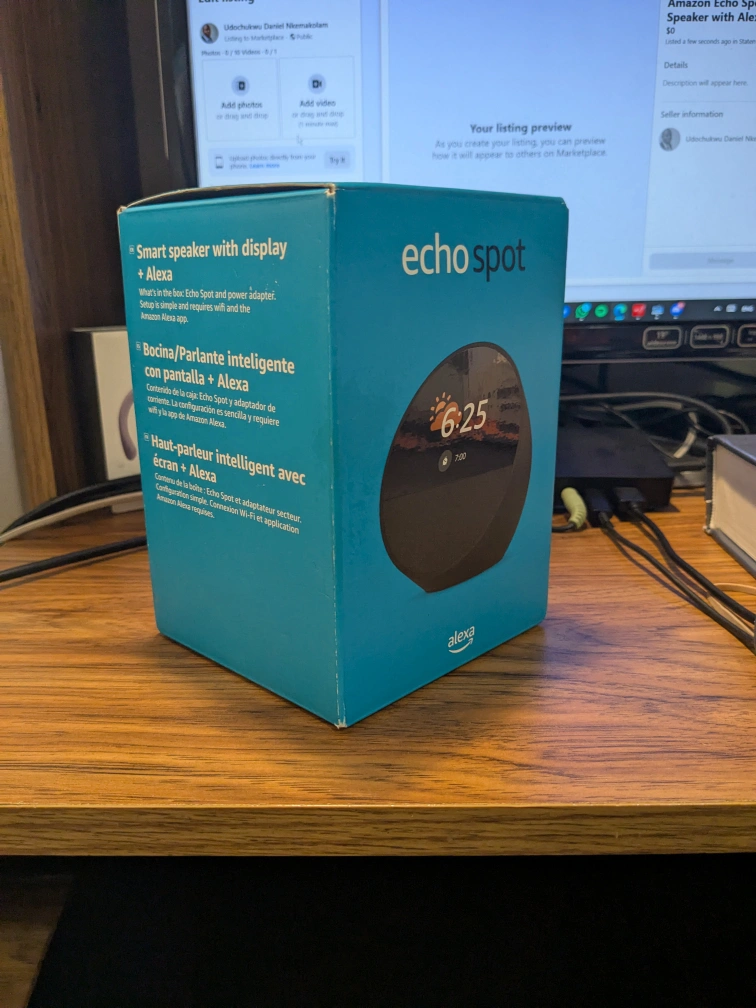 Selling an Amazon Echo Spot! It's a smart speaker with a display and Alexa built in. The box includes the Echo Spot and power adapter. Setup is simple and requires wifi and the Amazon Alexa app. Get the weather, play top hits, and more with just your voice