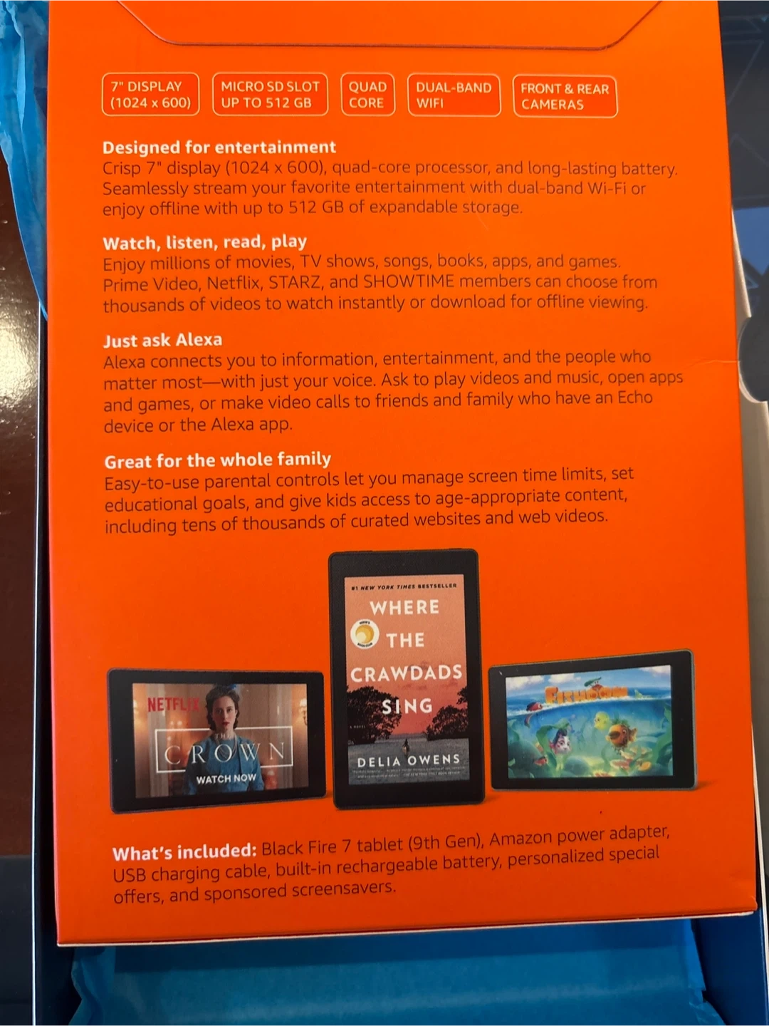 Brand new Amazon Fire 7 (9th Generation) tablet in black with 16GB of storage! It comes in the original box and includes a Black Fire 7 tablet, USB charging cable, built-in rechargeable battery, and personalized special offers. Key features include: - 7" display (1024 x 600) - Micro SD slot up to 512 GB - Quad-core processor - Dual-band Wi-Fi - Front & rear cameras Great for watching videos, reading, and playing games!