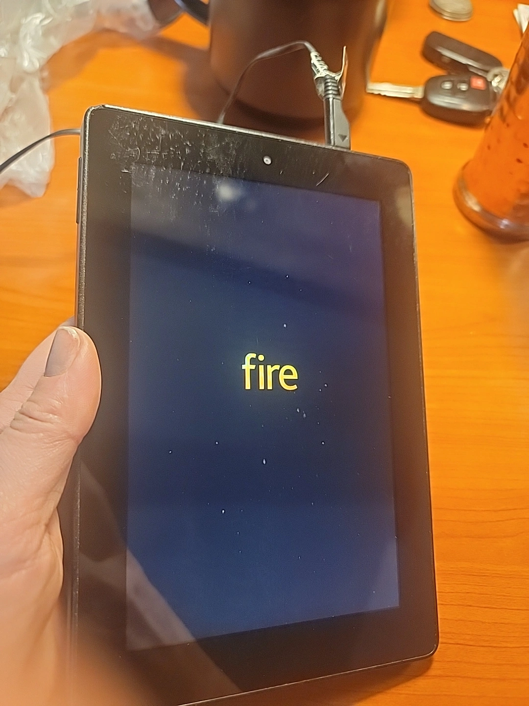 Selling an Amazon Fire tablet. It is black and has some signs of use.