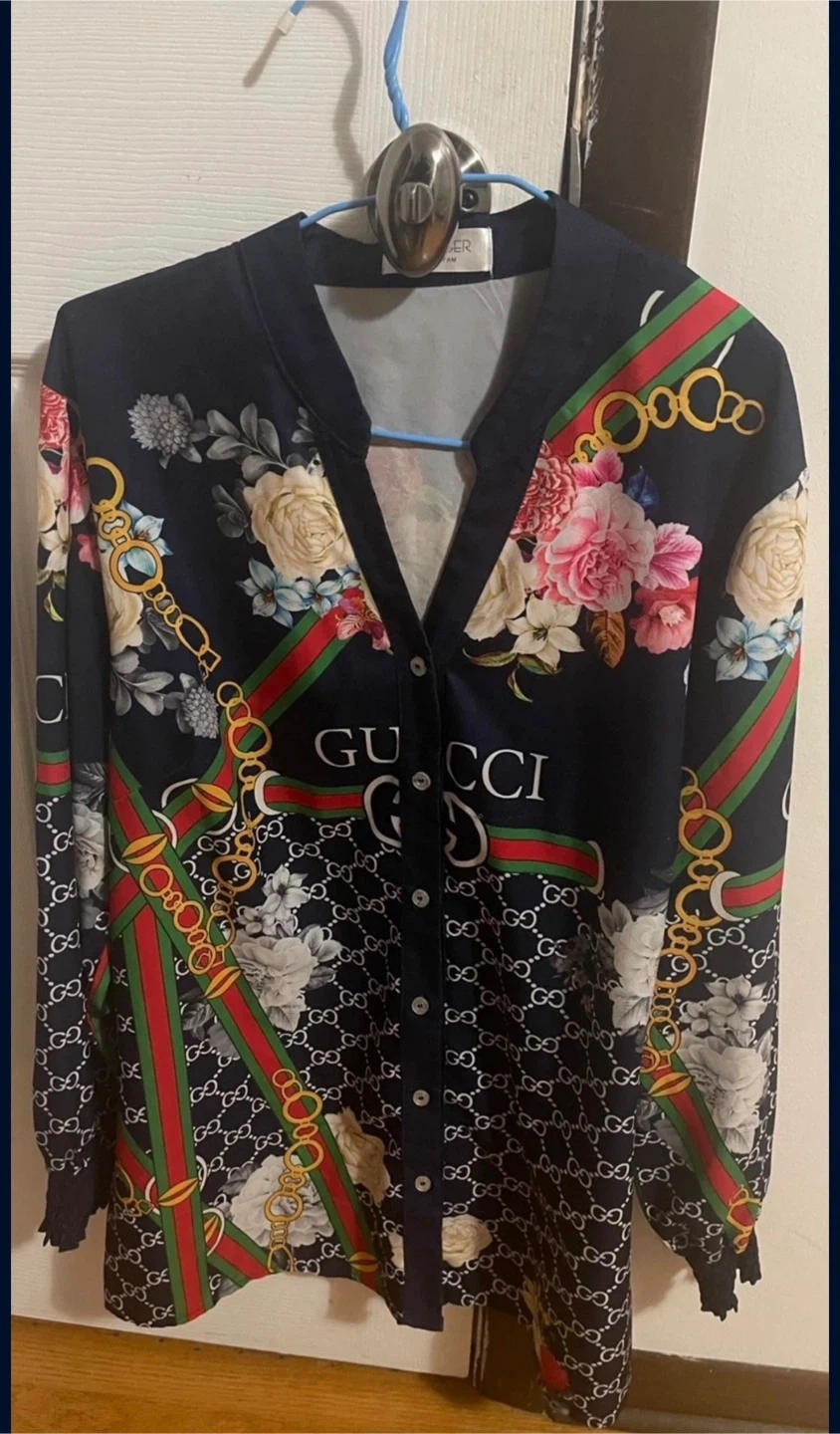 Selling a cute AMBERGER blouse with a floral and chain design. It has a navy blue trim and is in good condition. Perfect for adding a pop of color to your wardrobe!