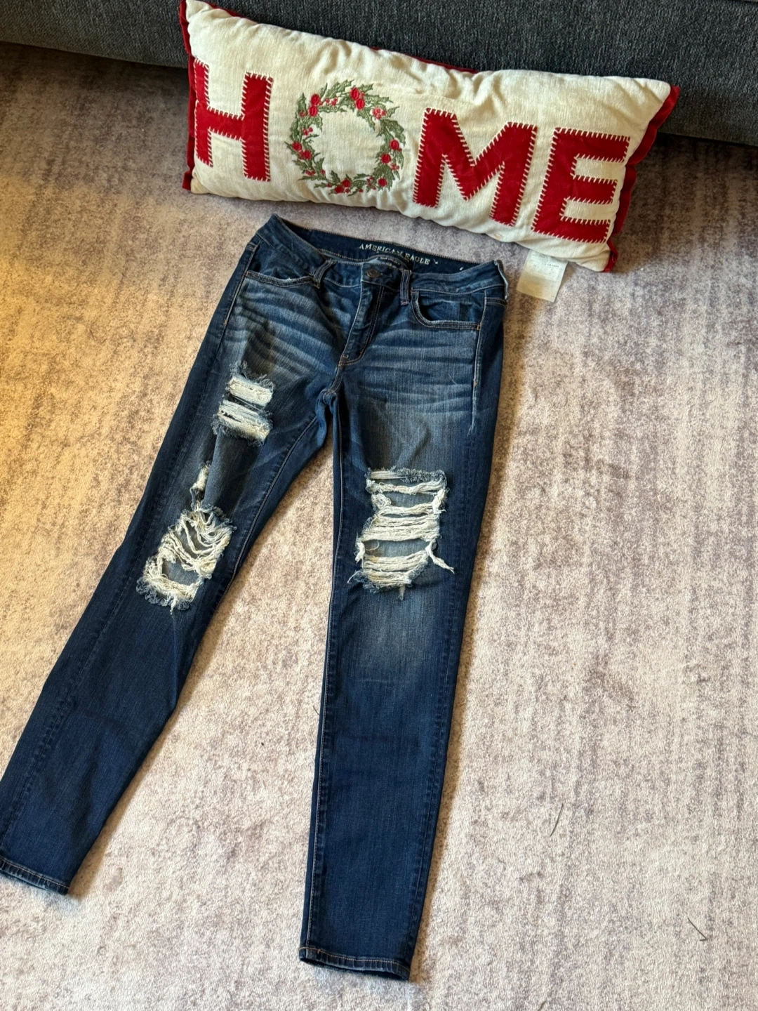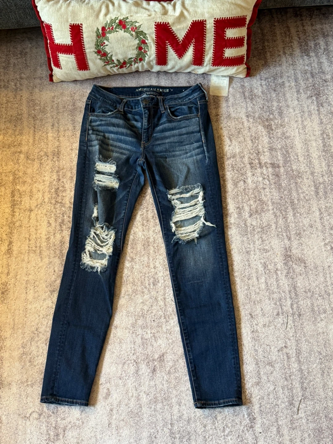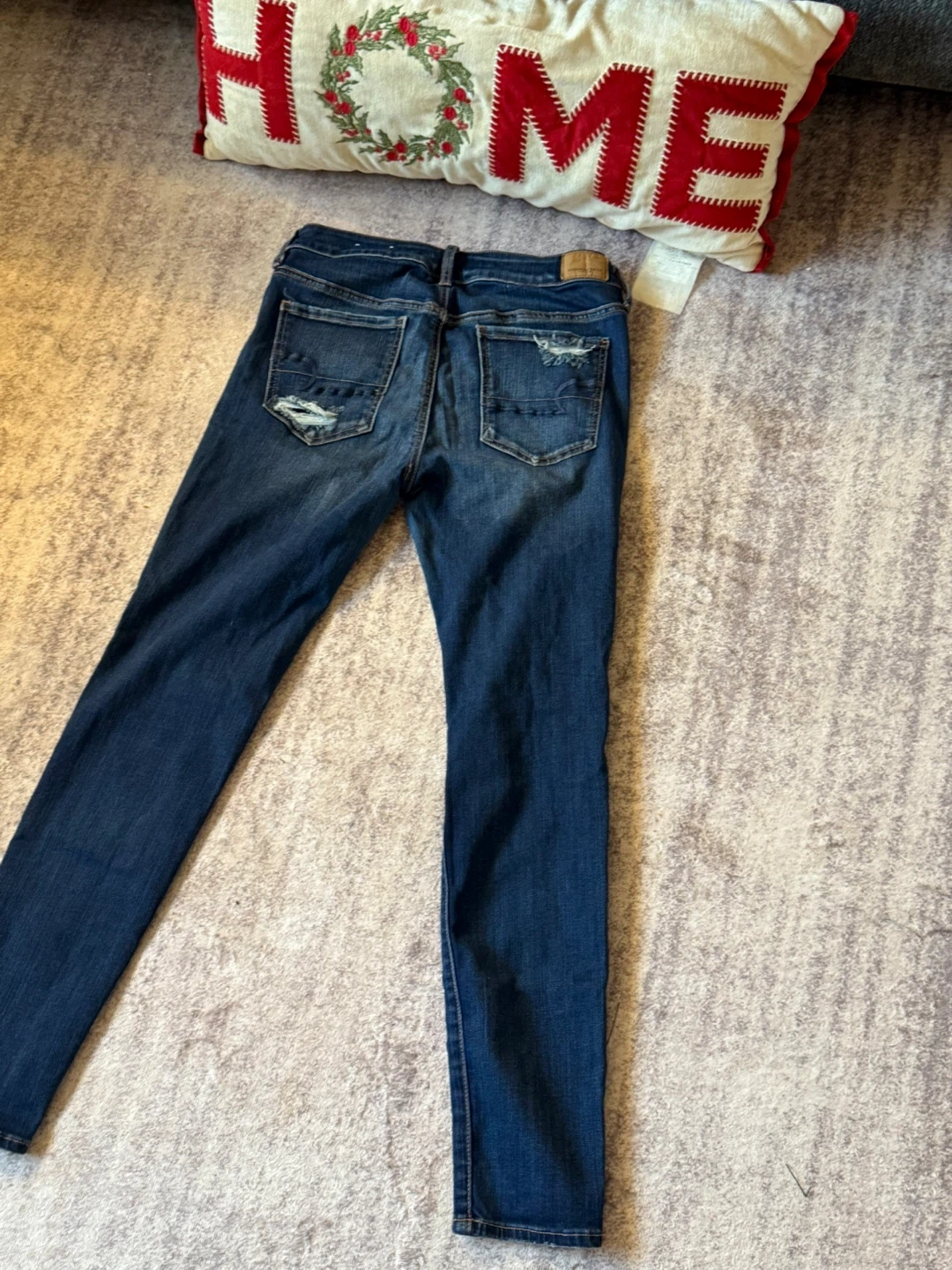 60Selling a pair of American Eagle dark wash jeans! These are a size 4 and feature a stylish ripped design. They're in great condition and ready for a new home