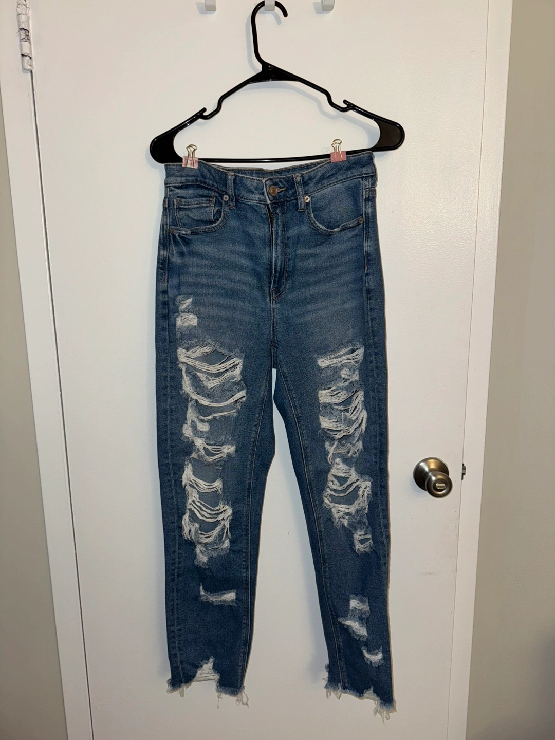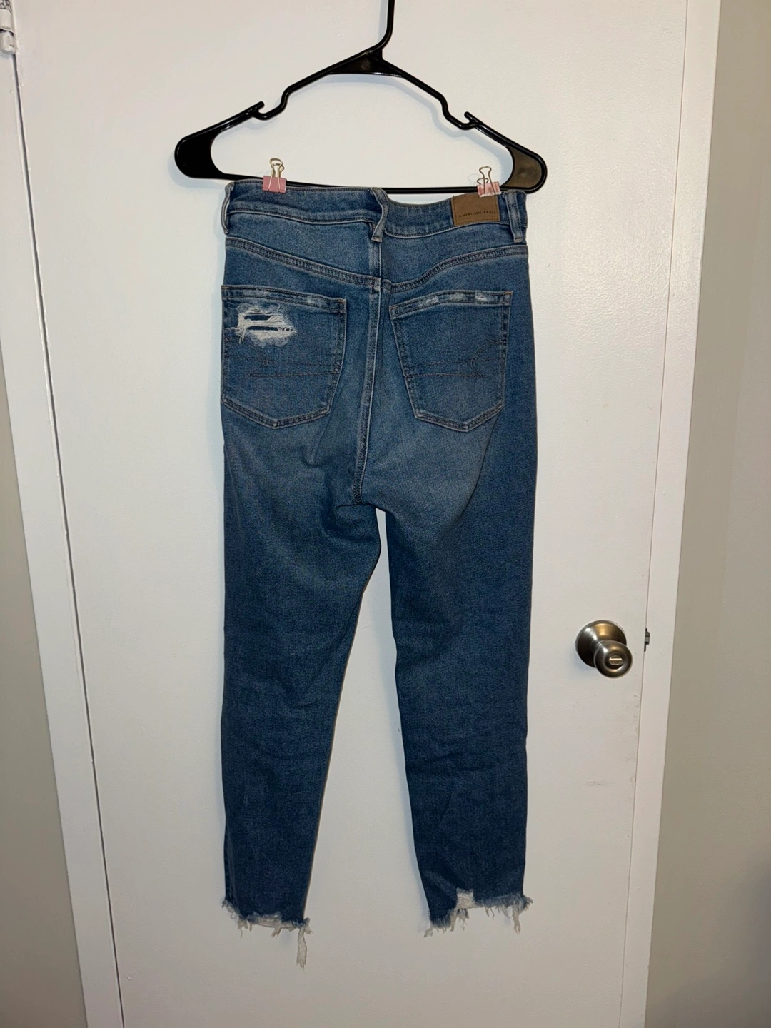 Selling a pair of American Eagle Mom jeans. They're in great condition and ready for a new home! The jeans feature a stylish, ripped design.
