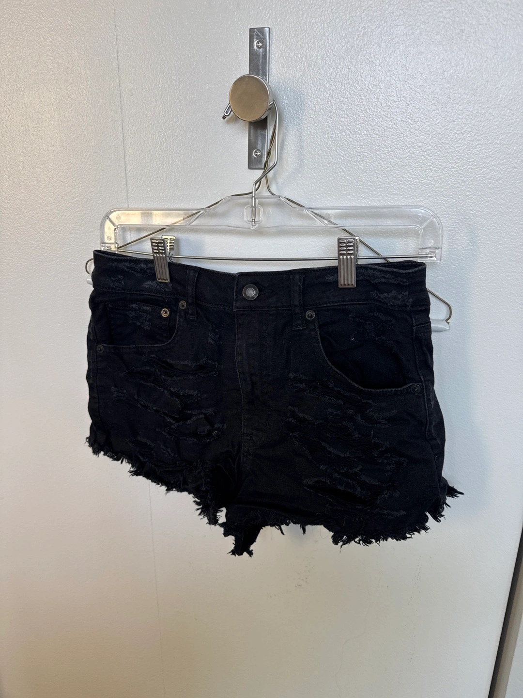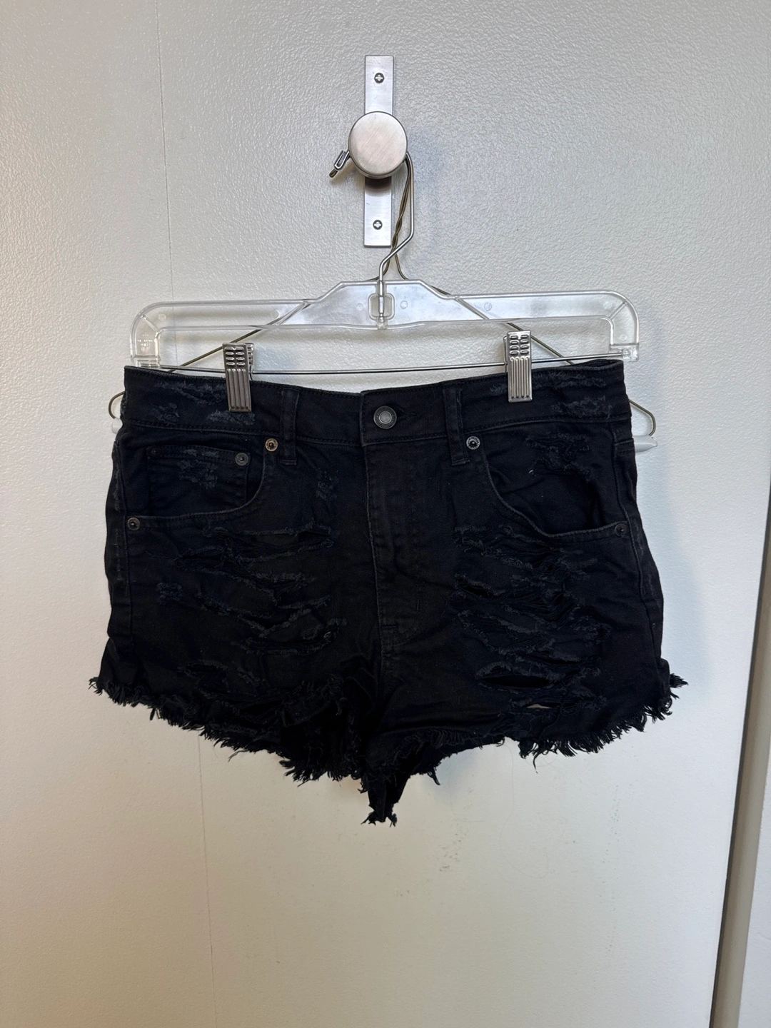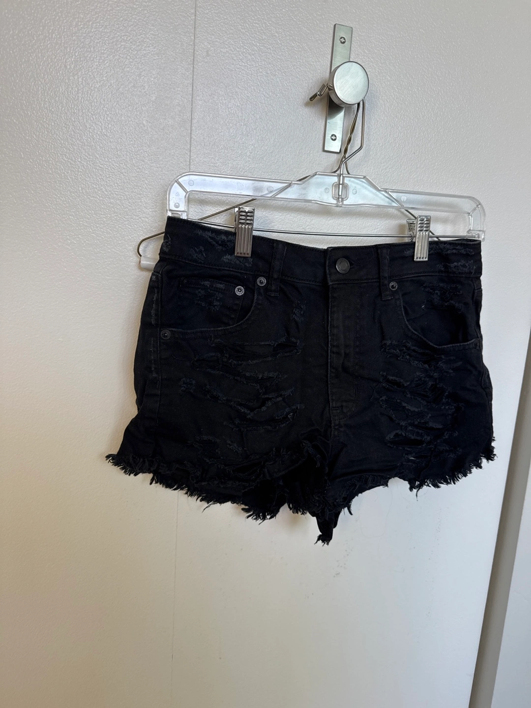 Selling a pair of American Eagle Vintage Hi-Rise Festival shorts in a size 4. They are black, stretchy, and have a distressed look. Perfect for a casual, edgy style!