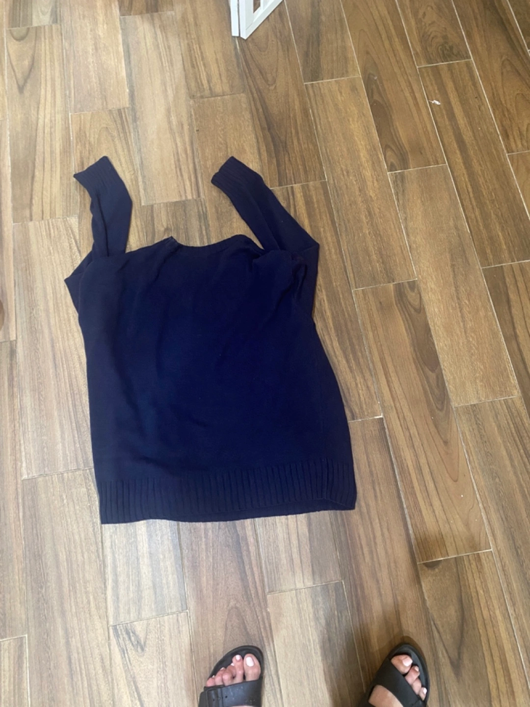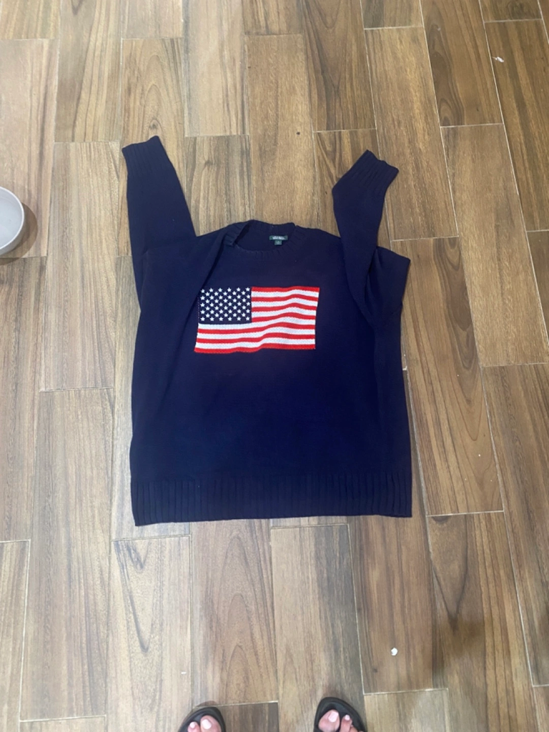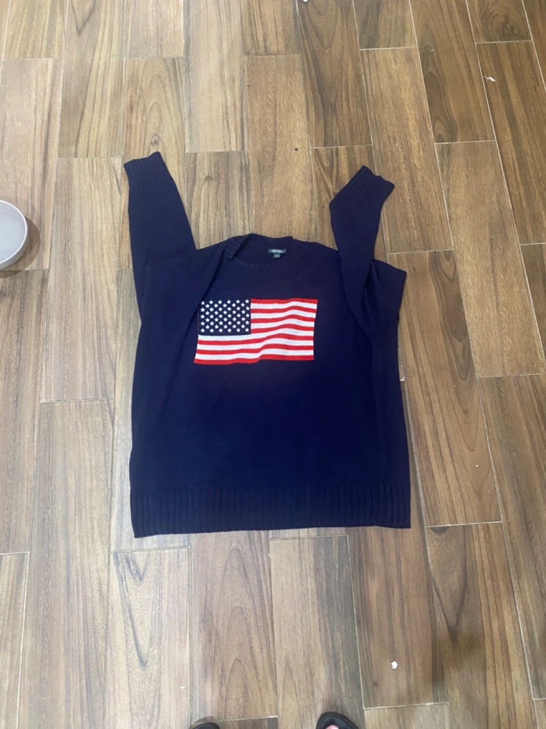 71Navy blue knit sweater. Features an American flag design. Long sleeves. Relaxed fit. Pick up in Bensonhurst bklyn Text 347-366-4713 See my other items for sale