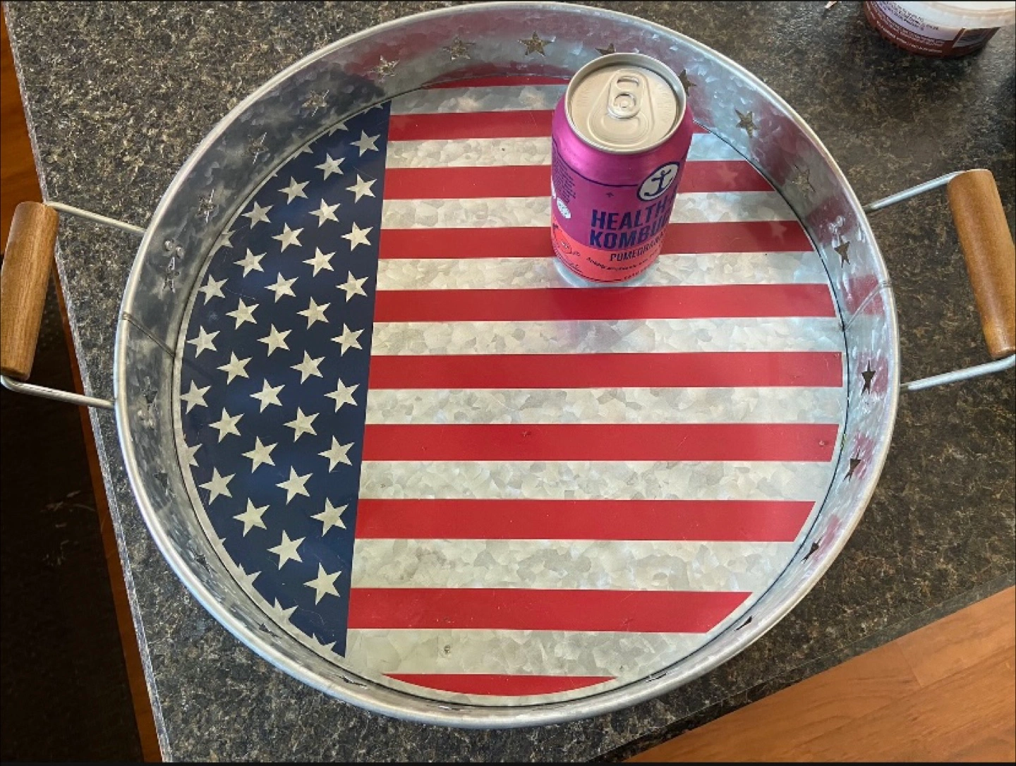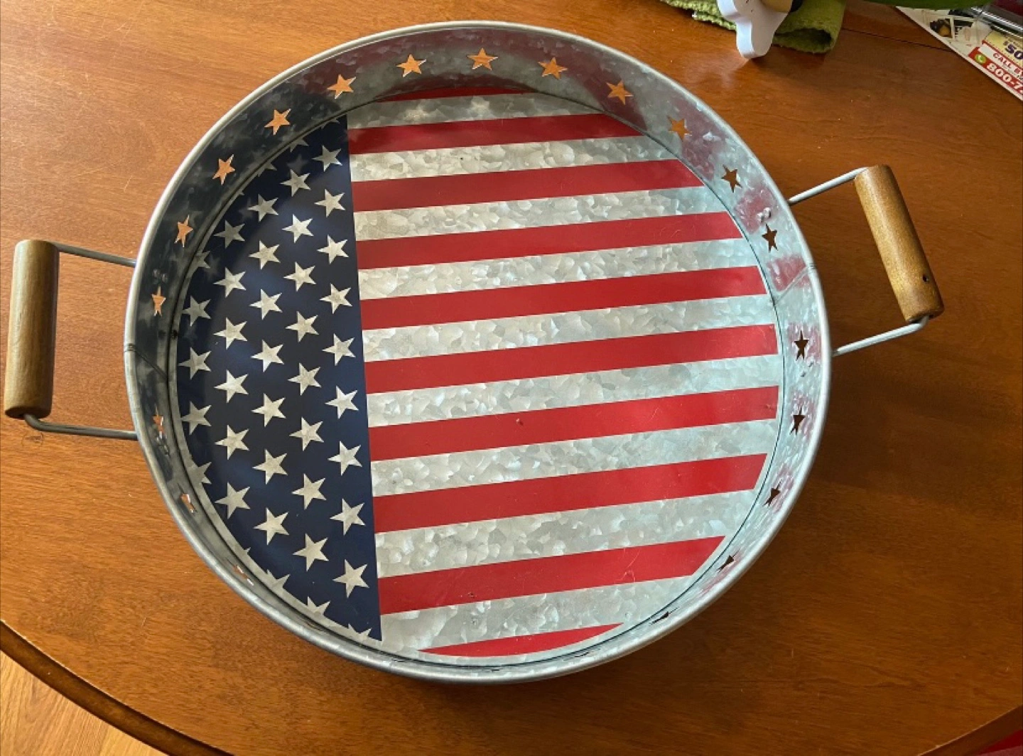 Never used- American Flag serving tray with wooden handles, 15 inches across