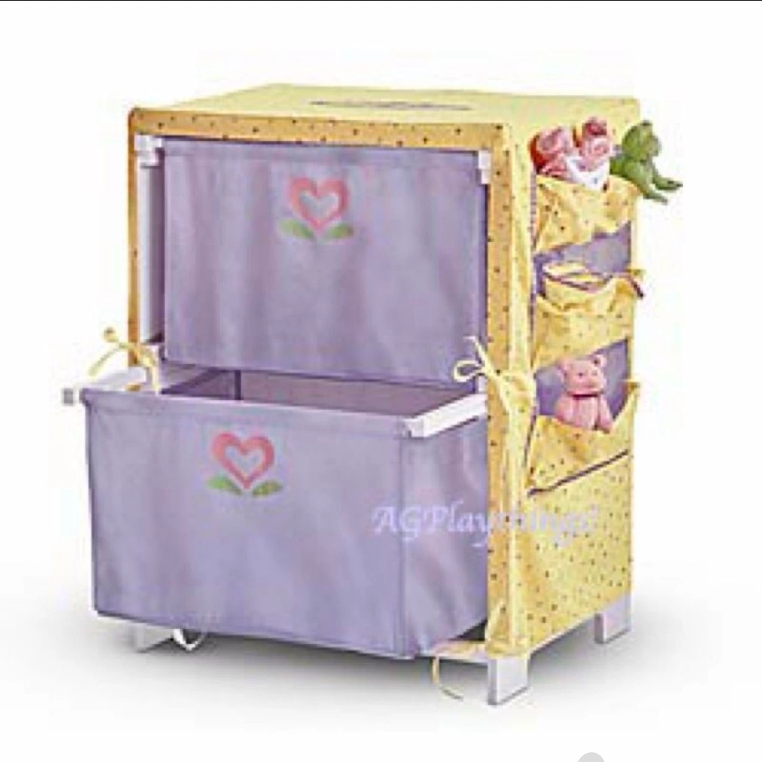 60Here's a Bitty Baby toy storage unit! It features two pull-out bins and side pockets for holding smaller items. It's perfect for organizing your little one's Bitty Baby accessories and toys