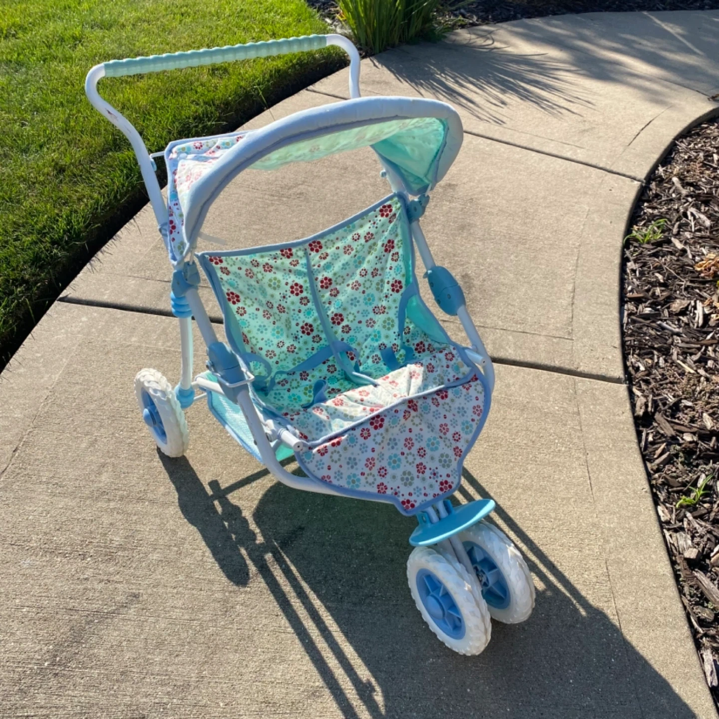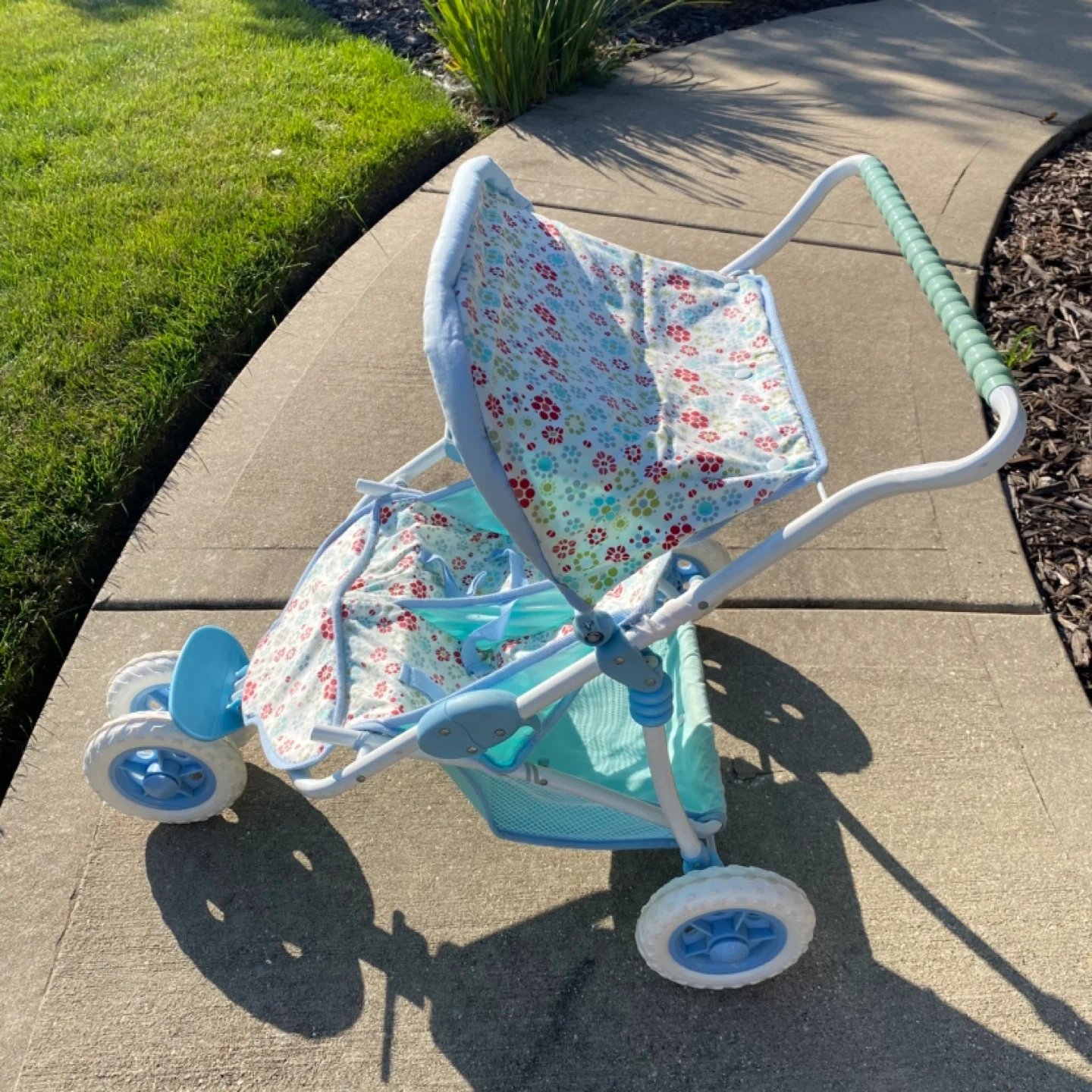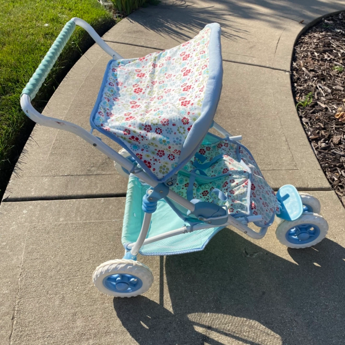 Here's a cute American Girl (retired) double doll stroller, perfect for bitty babies or your little one's favorite toy. It features a charming floral pattern and sturdy wheels for easy pushing. It's in great condition and ready for a new home! It also folds up for storage. It is used, but has plenty of use left … overall great condition, just minor wear from a little use.
