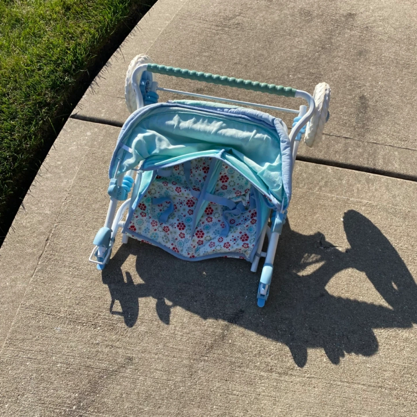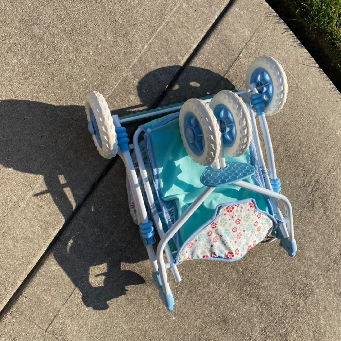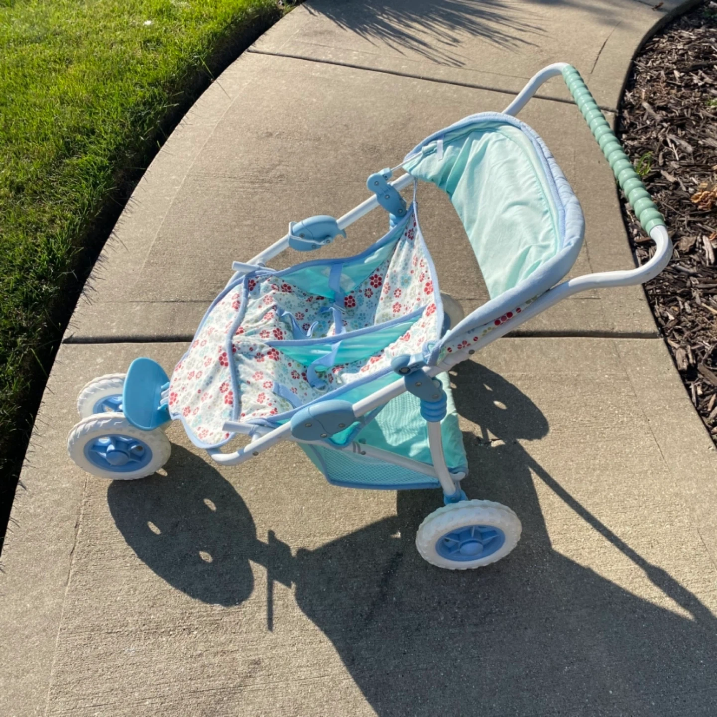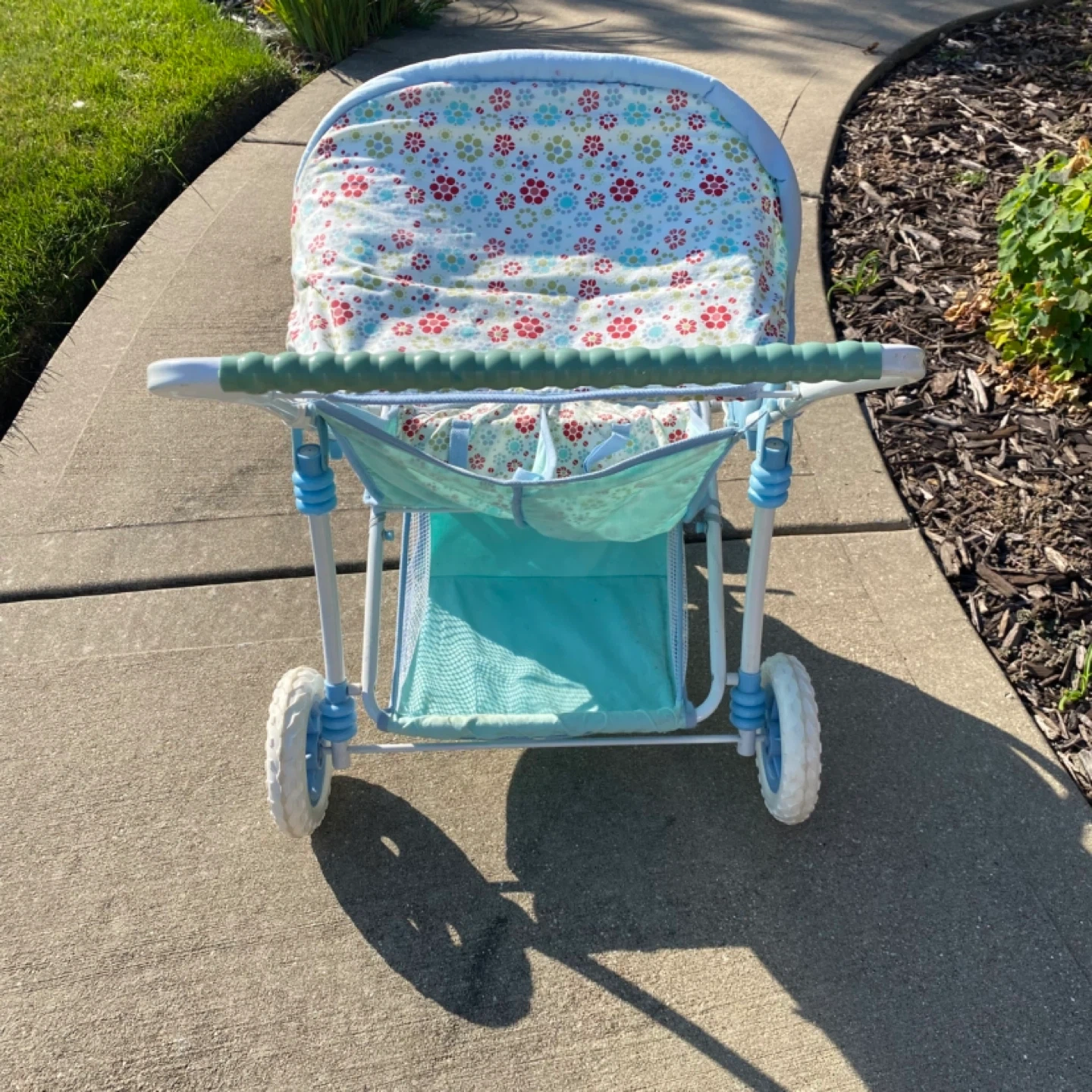 Here's a cute American Girl (retired) double doll stroller, perfect for bitty babies or your little one's favorite toy. It features a charming floral pattern and sturdy wheels for easy pushing. It's in great condition and ready for a new home! It also folds up for storage. It is used, but has plenty of use left … overall great condition, just minor wear from a little use.