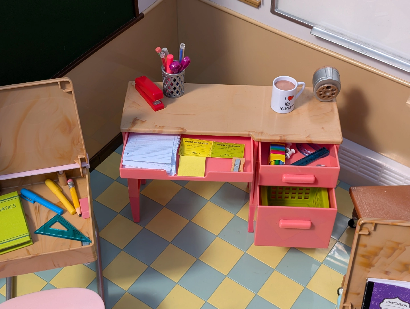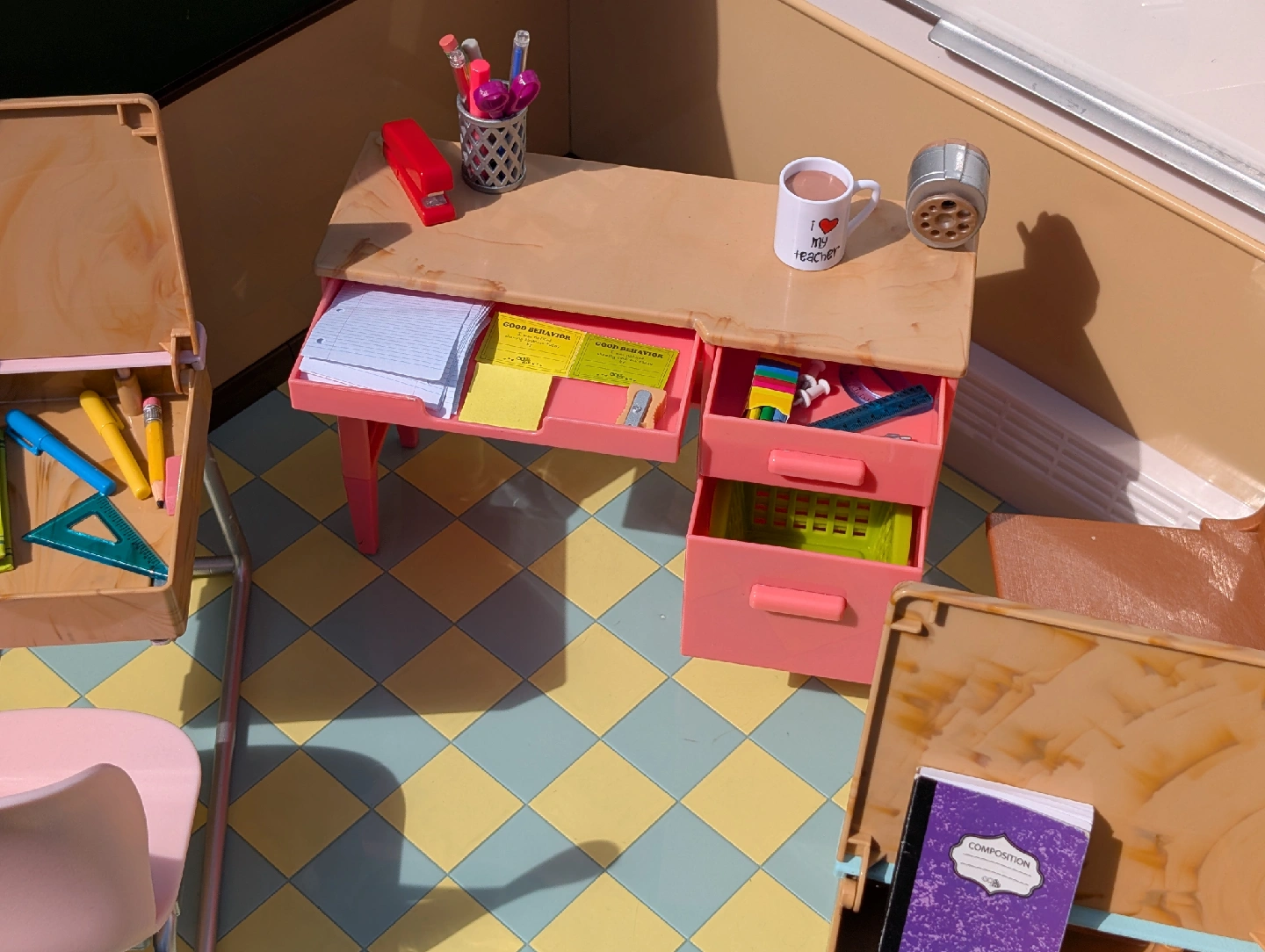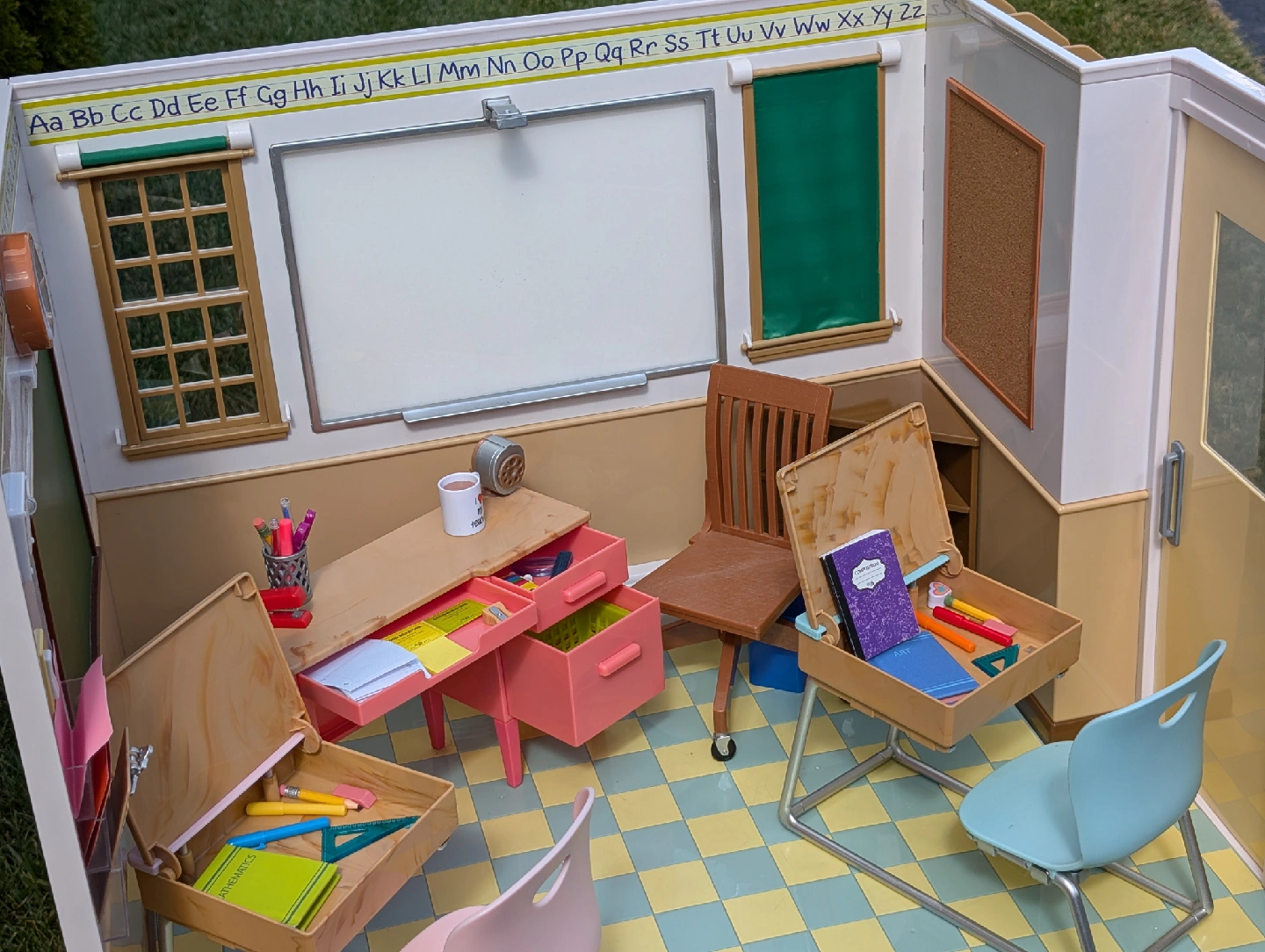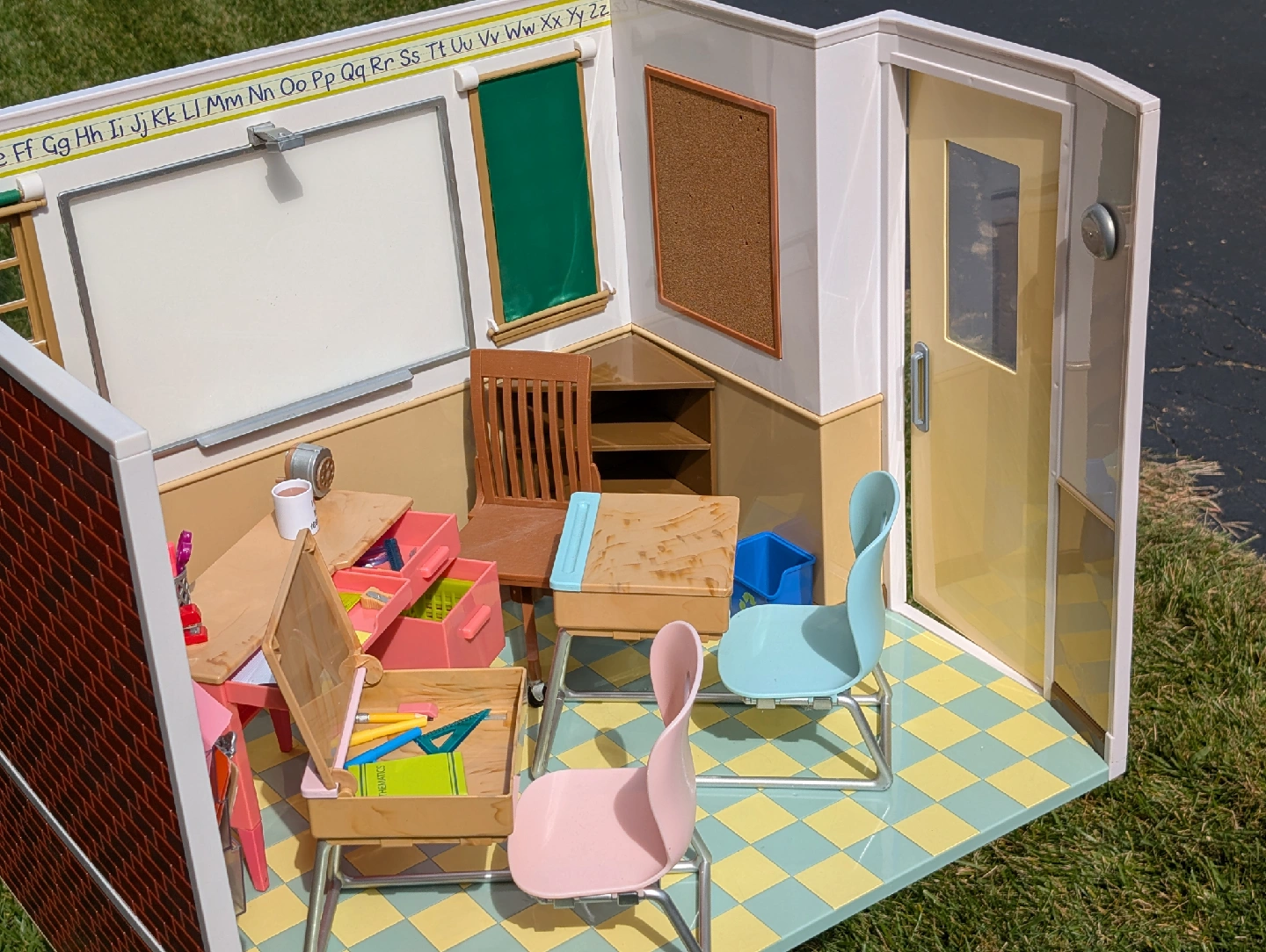 Selling an American Girl doll school playset. It includes desks, chairs, a teacher's desk, and other school-themed accessories. Great for imaginative play with your dolls! SMALL ELEMENTS CHOCKING HAZARD, the set has small elements be aware when thinking about buying this fabulous classroom. There is a real clock (needs batteries), light over withe board, bell for break, fire alarm, on one side you have lockers and door to enter the classroom it is 28 in tall 20 in wide 20 deep.
