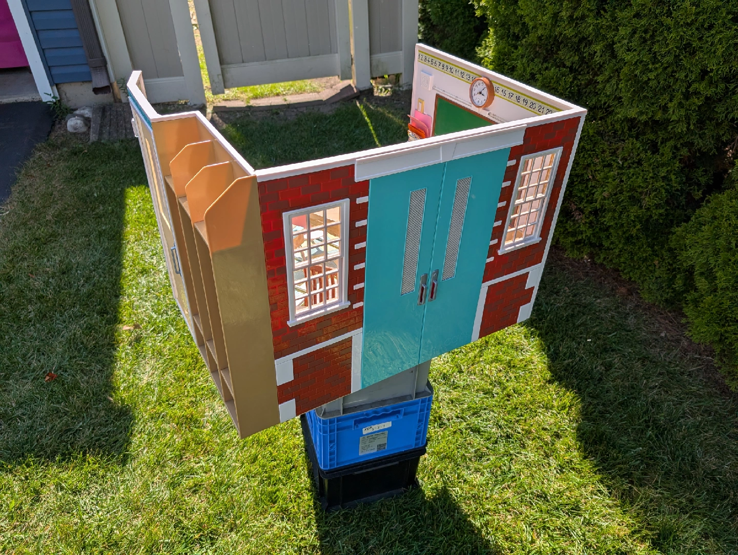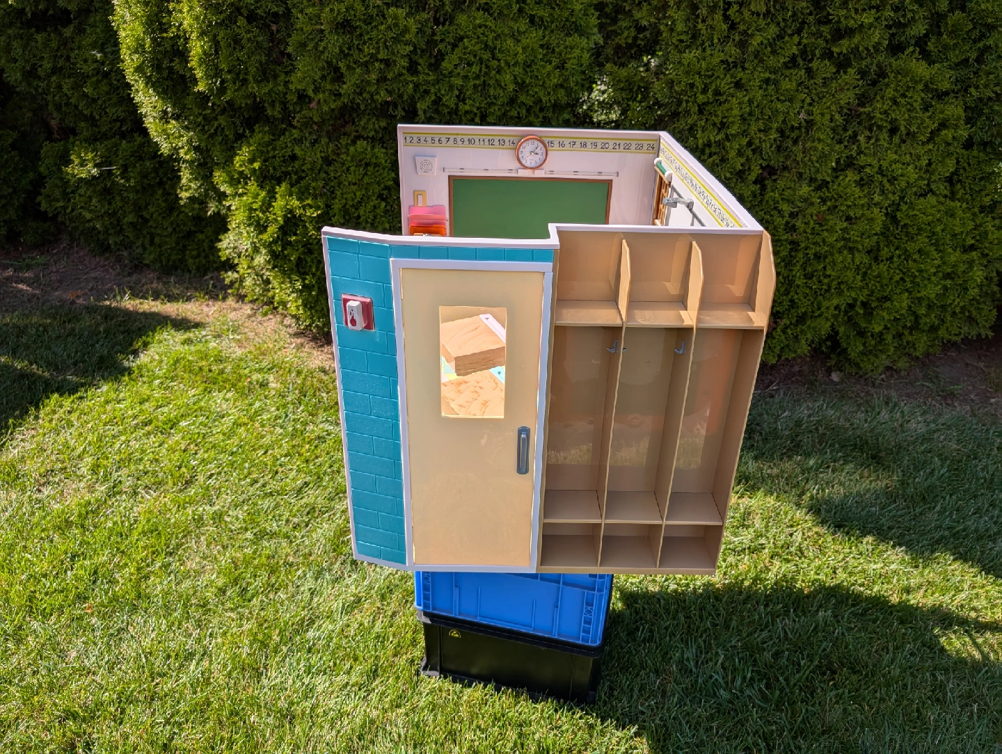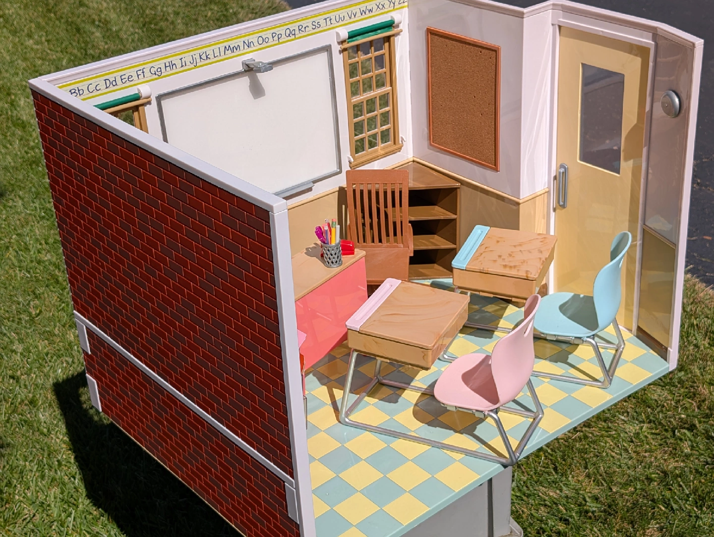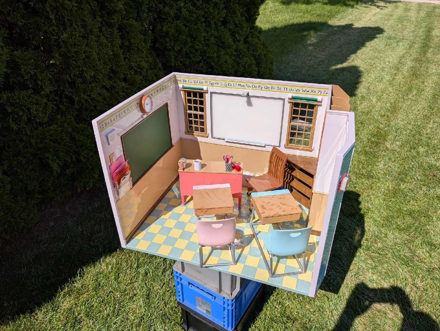 Selling an American Girl doll school playset. It includes desks, chairs, a teacher's desk, and other school-themed accessories. Great for imaginative play with your dolls! SMALL ELEMENTS CHOCKING HAZARD, the set has small elements be aware when thinking about buying this fabulous classroom. There is a real clock (needs batteries), light over withe board, bell for break, fire alarm, on one side you have lockers and door to enter the classroom it is 28 in tall 20 in wide 20 deep.