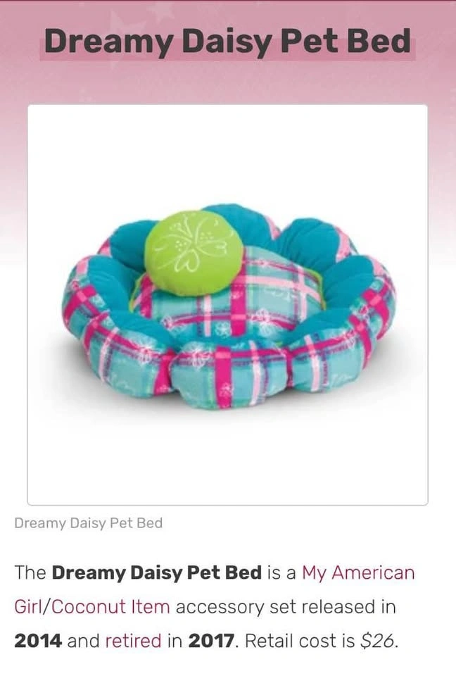 65Dreamy Daisy Pet Bed, by American Girl. In excellent used condition. No stains or rips. Bed comes with matching dog pillow. Bed is soft and fluffy, and is reversible. **Dog is NOT included, just used for size reference** Original price for bed & pillow $26. Cash only. Meet in Garfield Ridge, Chicago, near Midway. Willing to meet near Oak Lawn, EP, Alsip ☺️