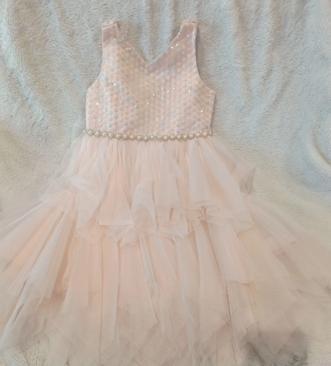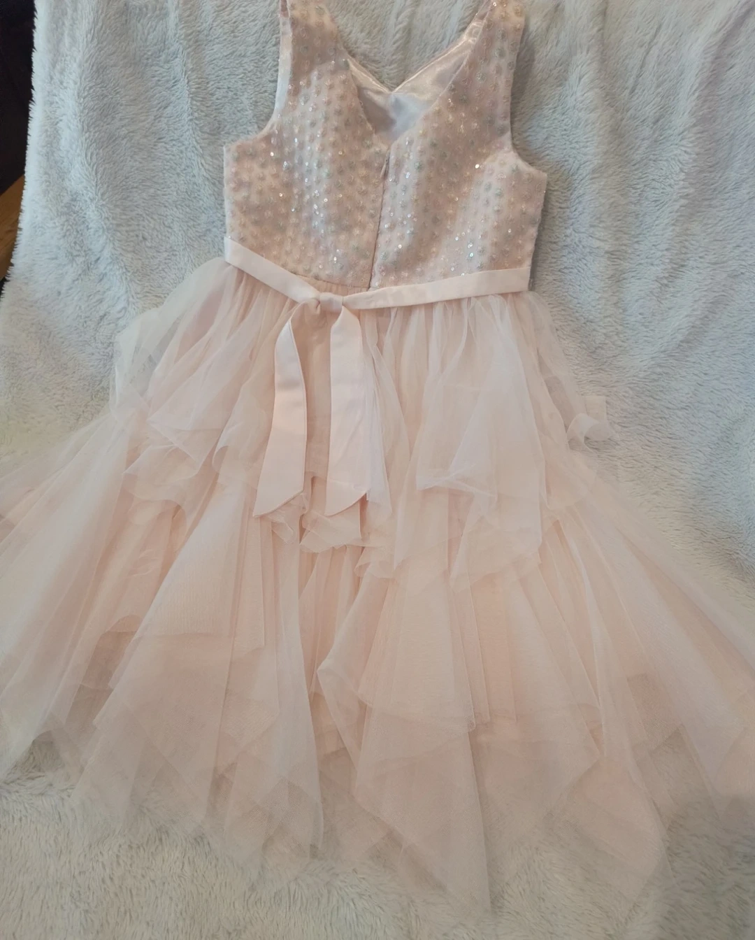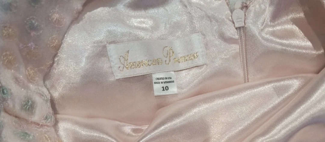 65Beautiful American Princess dress in a size 10! It's a light pink color with a tulle skirt and some sparkly accents on the bodice. Perfect for a special occasion!