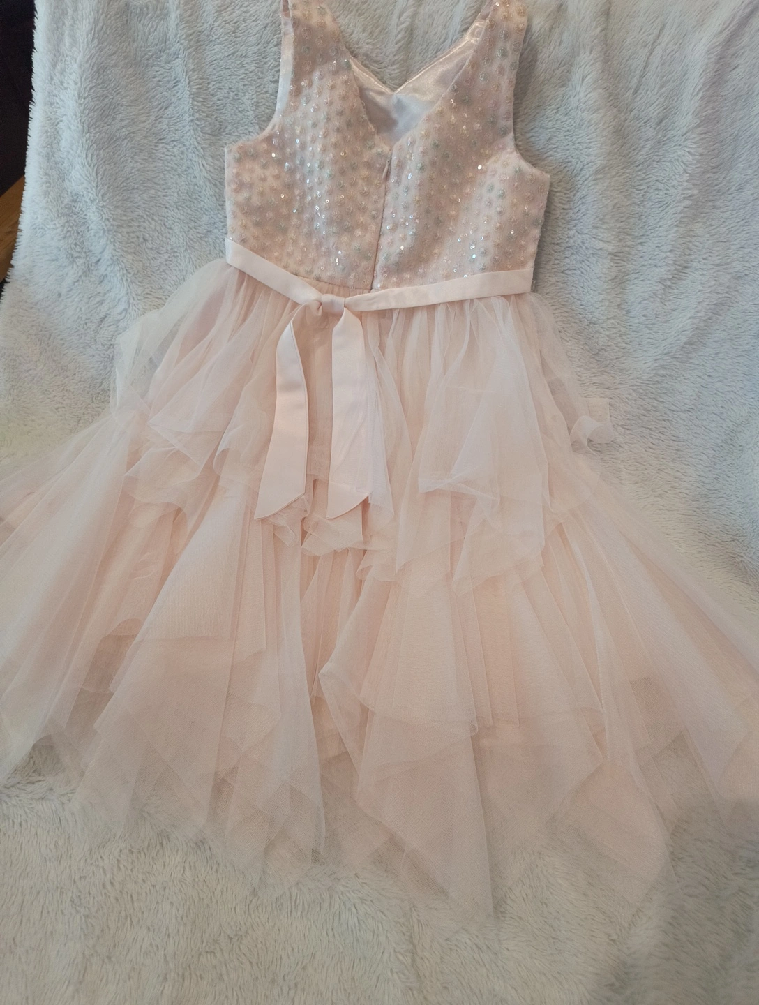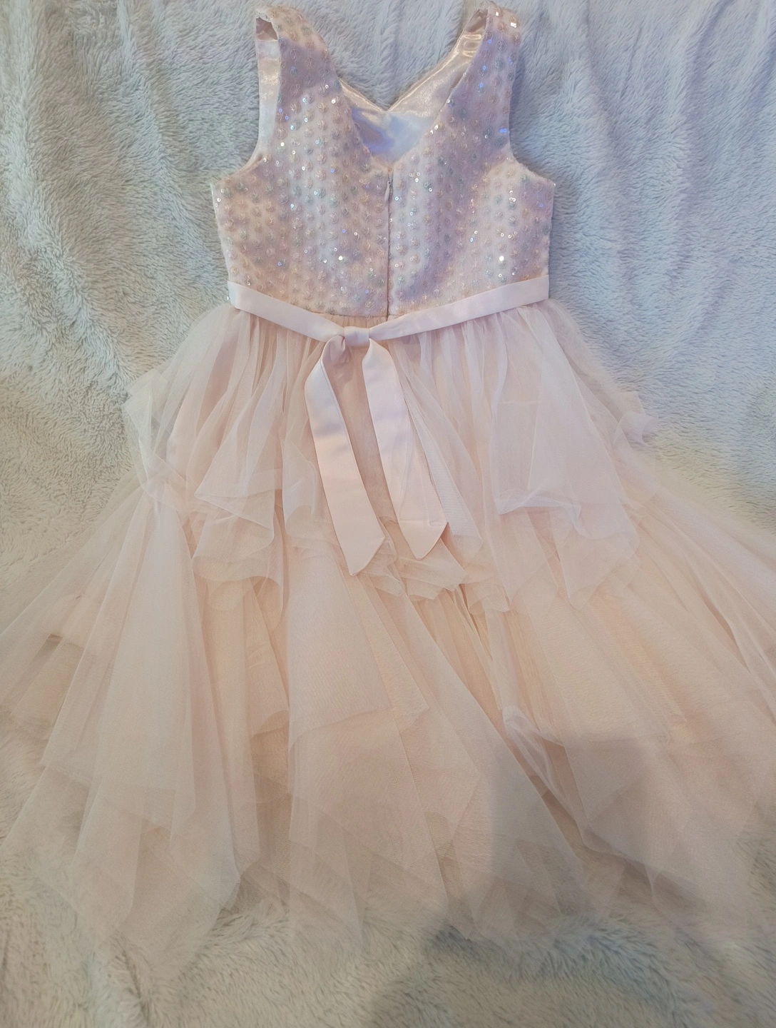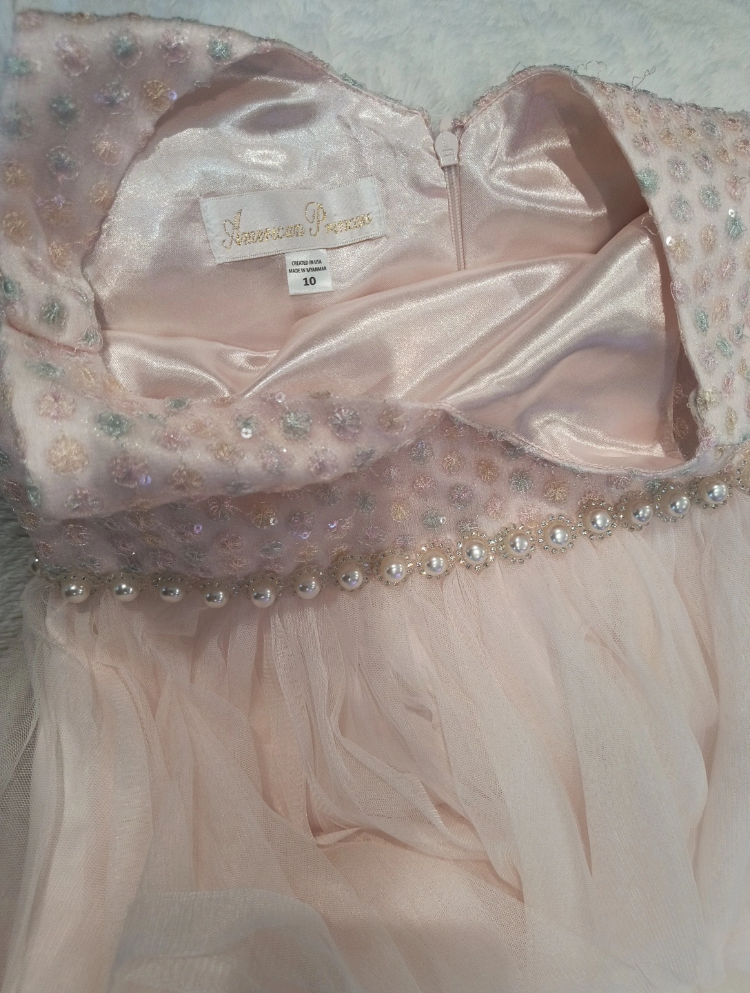 65Beautiful American Princess dress in a size 10! It's a light pink color with a tulle skirt and some sparkly accents on the bodice. Perfect for a special occasion!