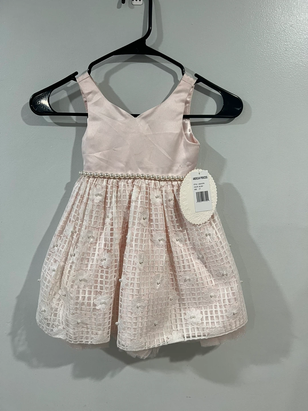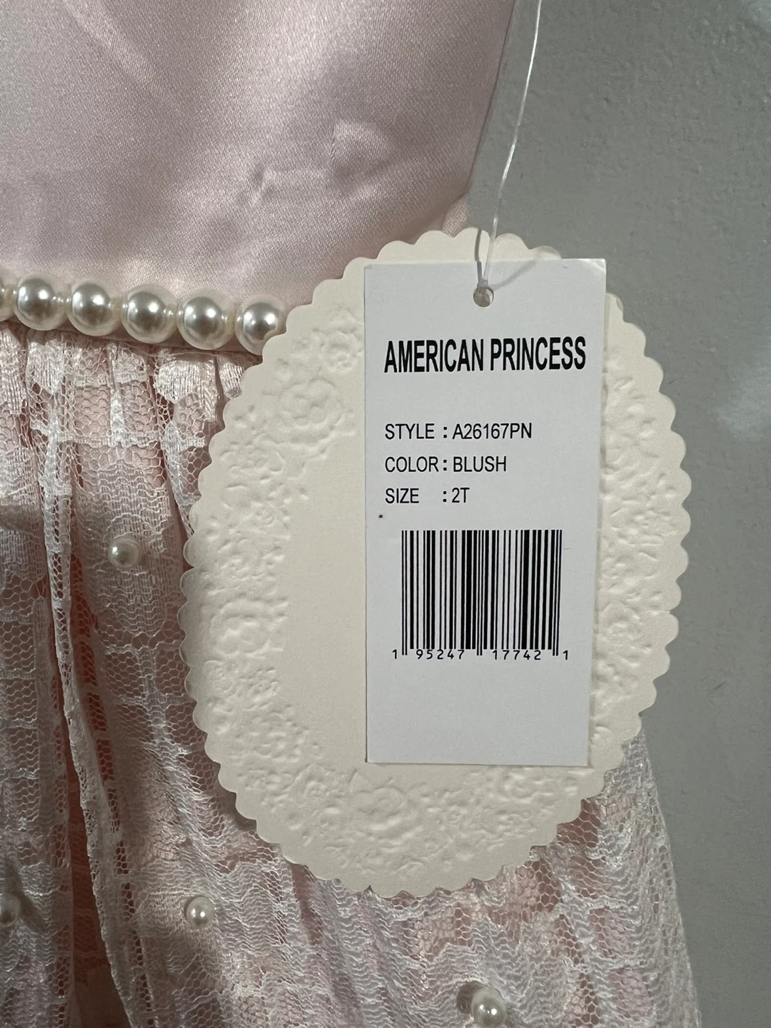 This adorable American Princess dress is in excellent condition! It's a blush color and size 2T. The style number is A26167PN. It features a cute design with pearl accents and a ribbon tie. Perfect for a special occasion!