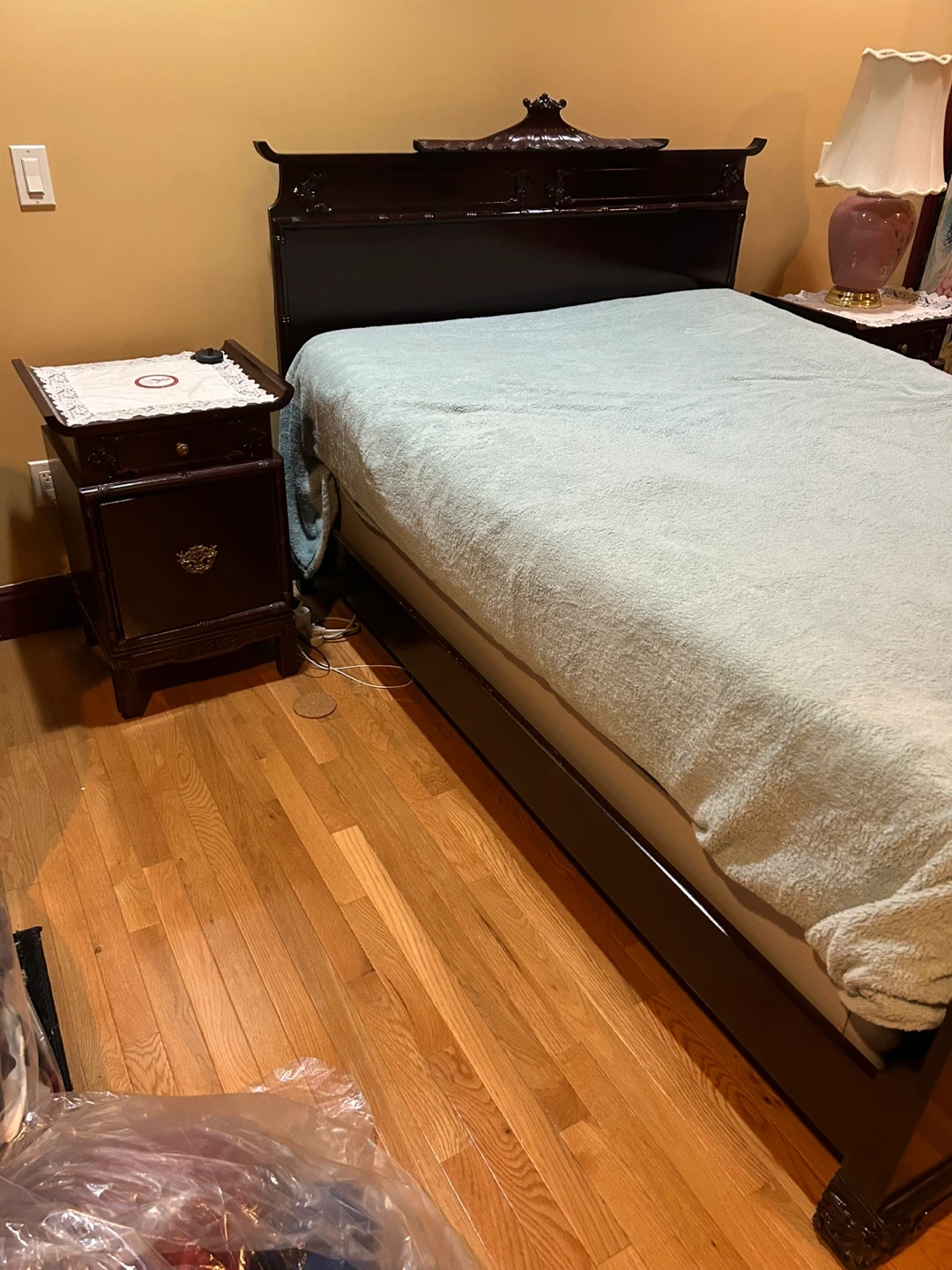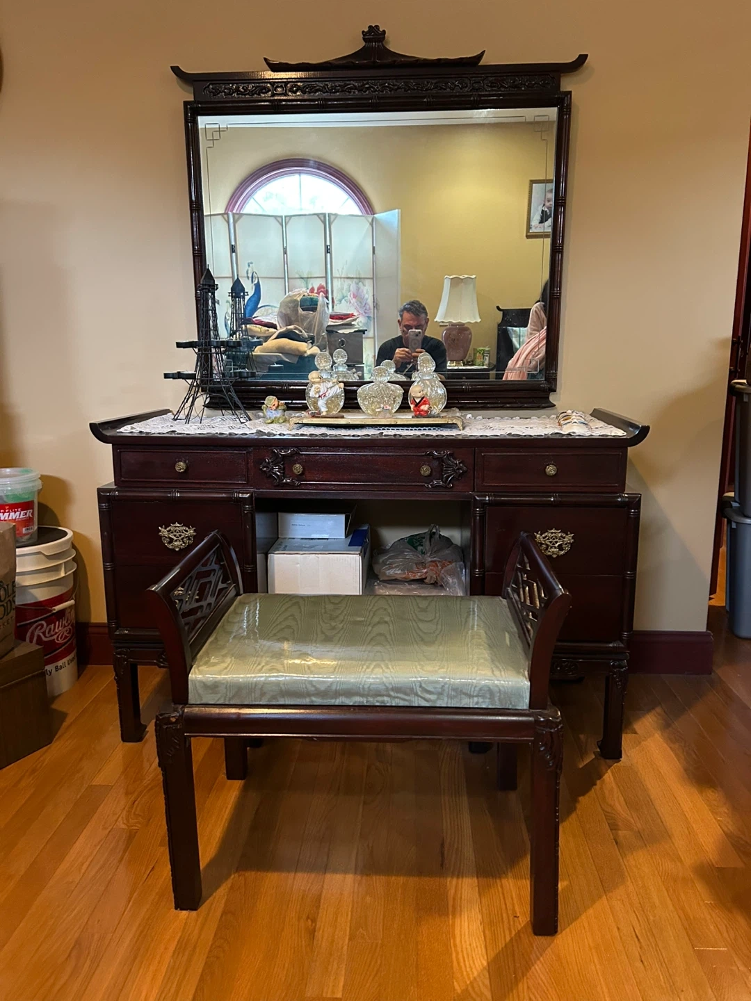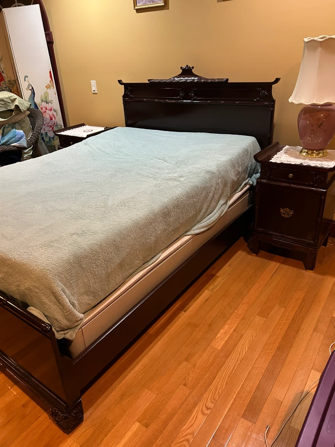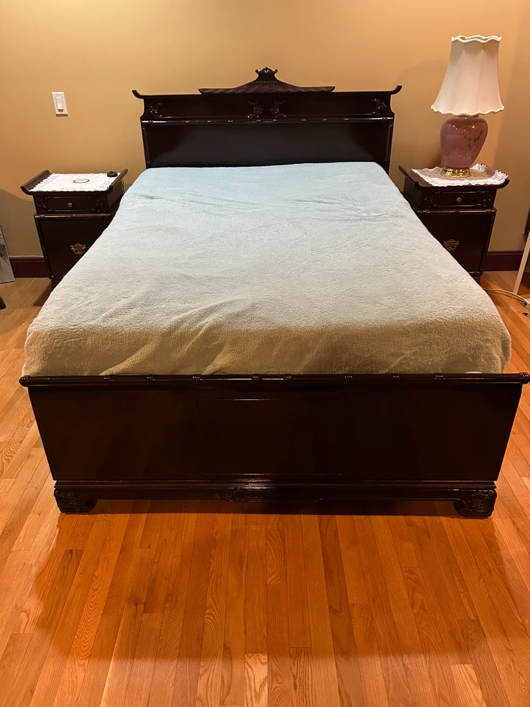 10Selling a dark solid wood antique full size bed frame with two matching nightstands, two dressers, vanity with bench and two matching mirrors. The set has a classic and elegant design with detailed carvings. It's in good condition and would be a great addition to any bedroom