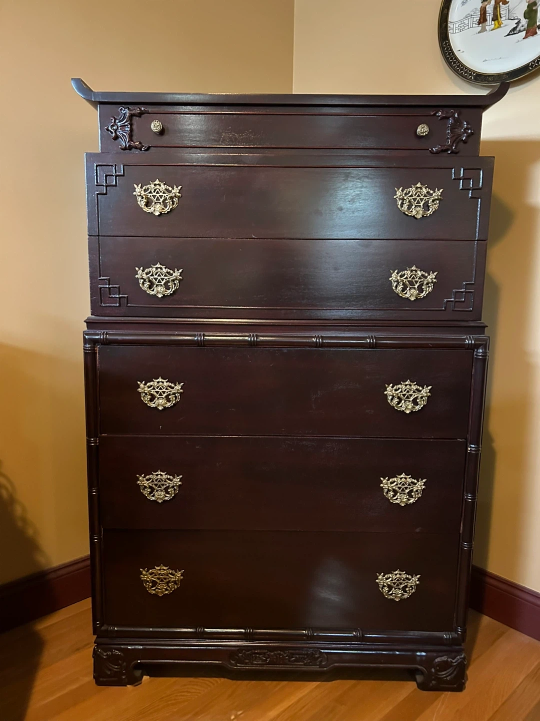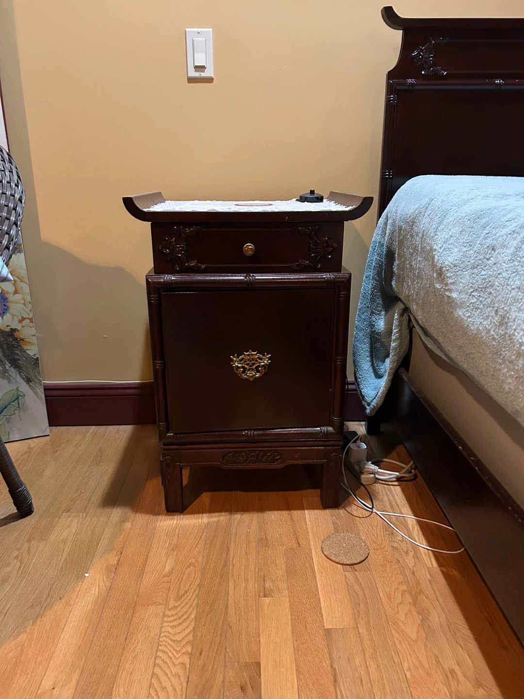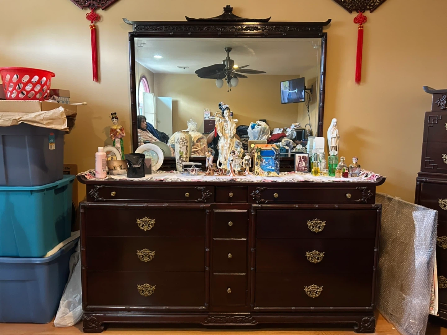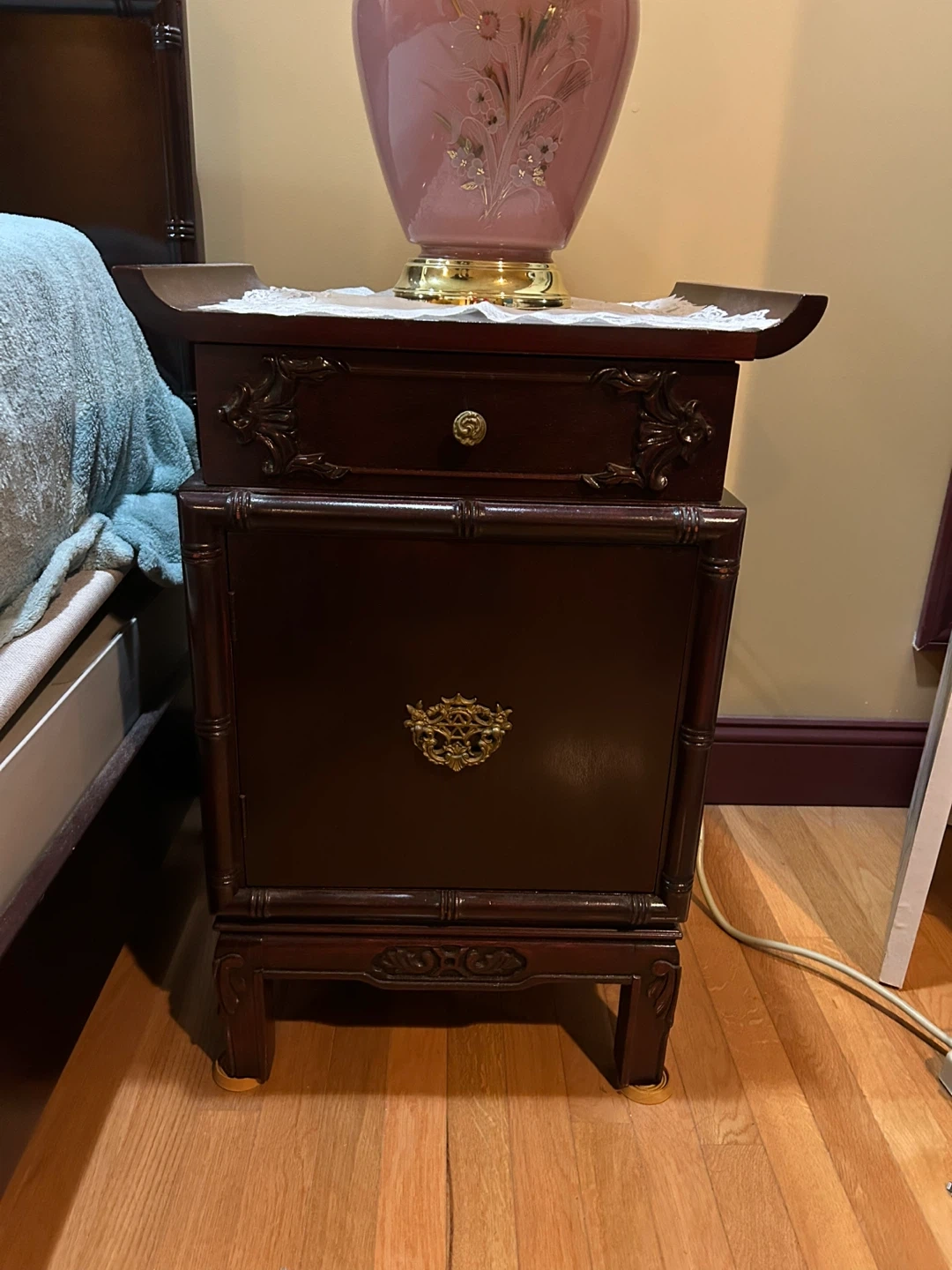 10Selling a dark solid wood antique full size bed frame with two matching nightstands, two dressers, vanity with bench and two matching mirrors. The set has a classic and elegant design with detailed carvings. It's in good condition and would be a great addition to any bedroom
