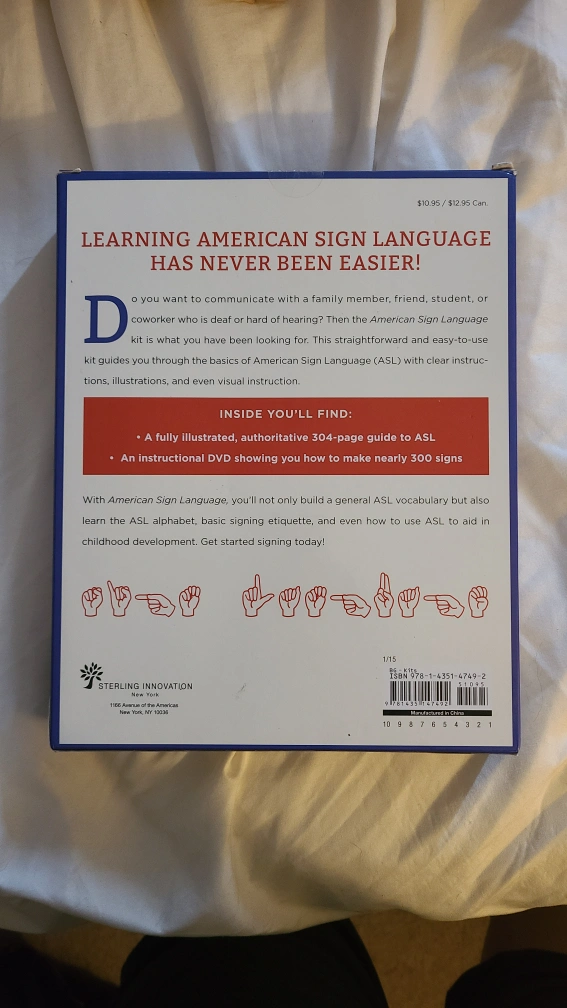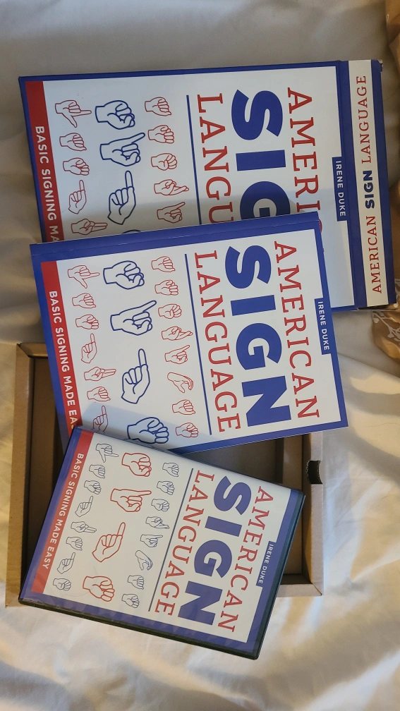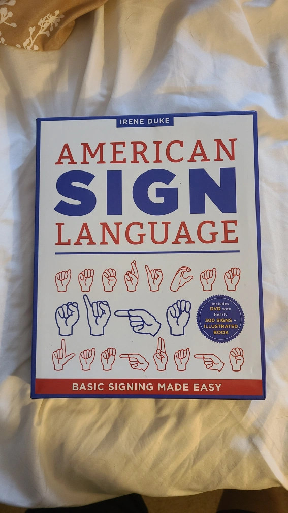 I'm selling an American Sign Language book and DVD set by Irene Duke. The book is a basic signing guide, making it easy to learn. Everything, disc included, is in excellent condition. It includes: - A fully illustrated, authoritative 304-page guide to ASL - An instructional DVD showing you how to make nearly 300 signs Originally retailed for $10.95.