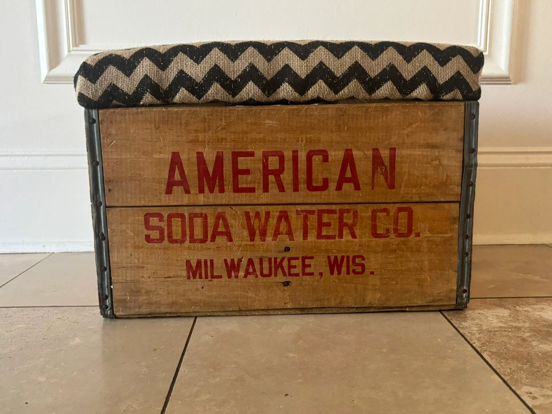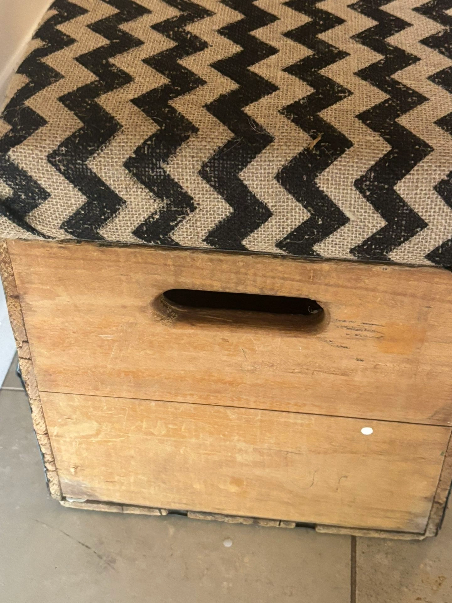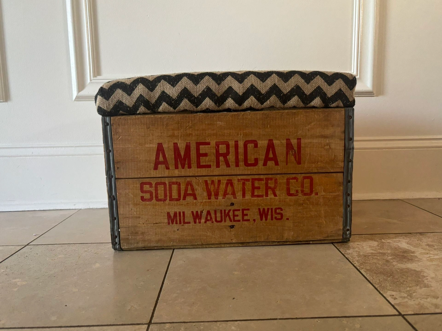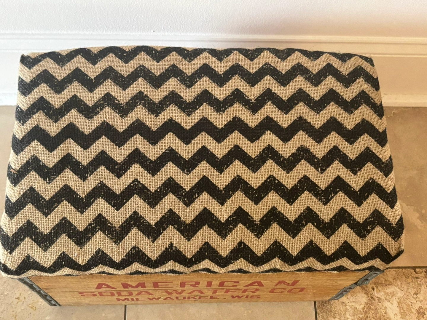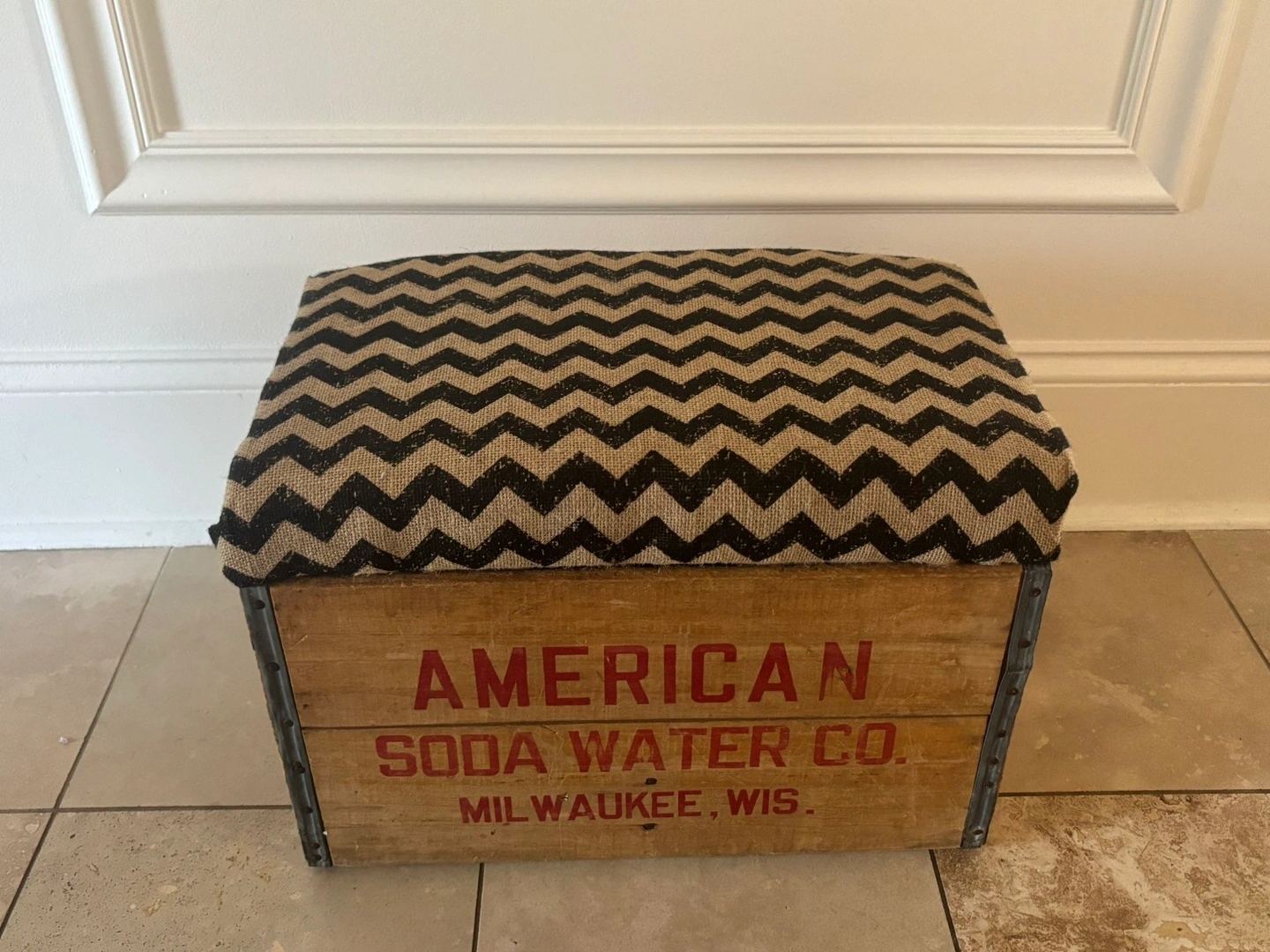 10Upcycled American soda footstool/crate. Rustic crate turned into a one of a kind foot stool. Excellent vintage piece for any living room or family room. Beautiful burlap pattern removeable top great for resting one’s feet after a long day. Plenary of storage also. Measurements are 19”w x 13”h x 11 1/2” d.