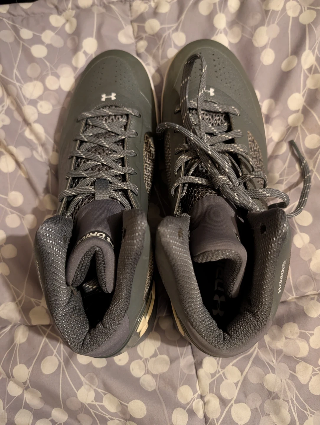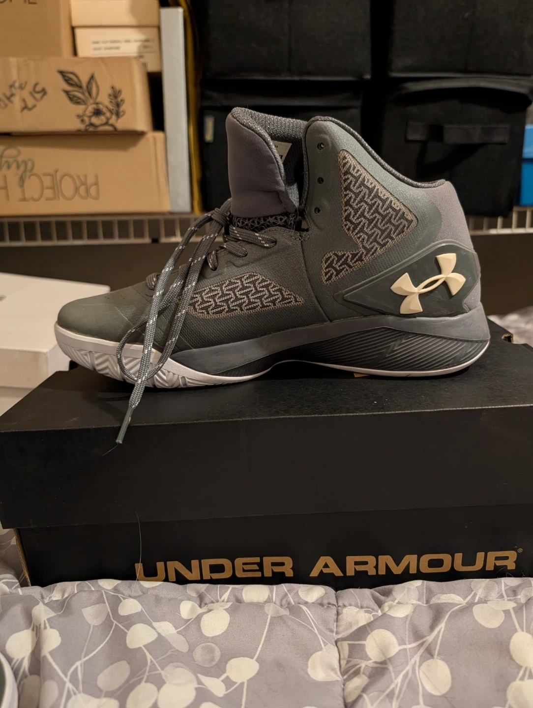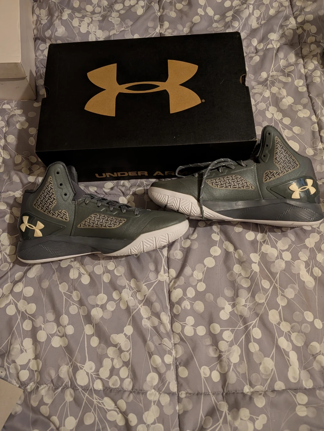 Gray Under Armour basketball shoes for men, size 9.5. These shoes feature a mid-top design and a secure lacing system. They come with the original box. Built for performance on the court! Brand new, never worn.